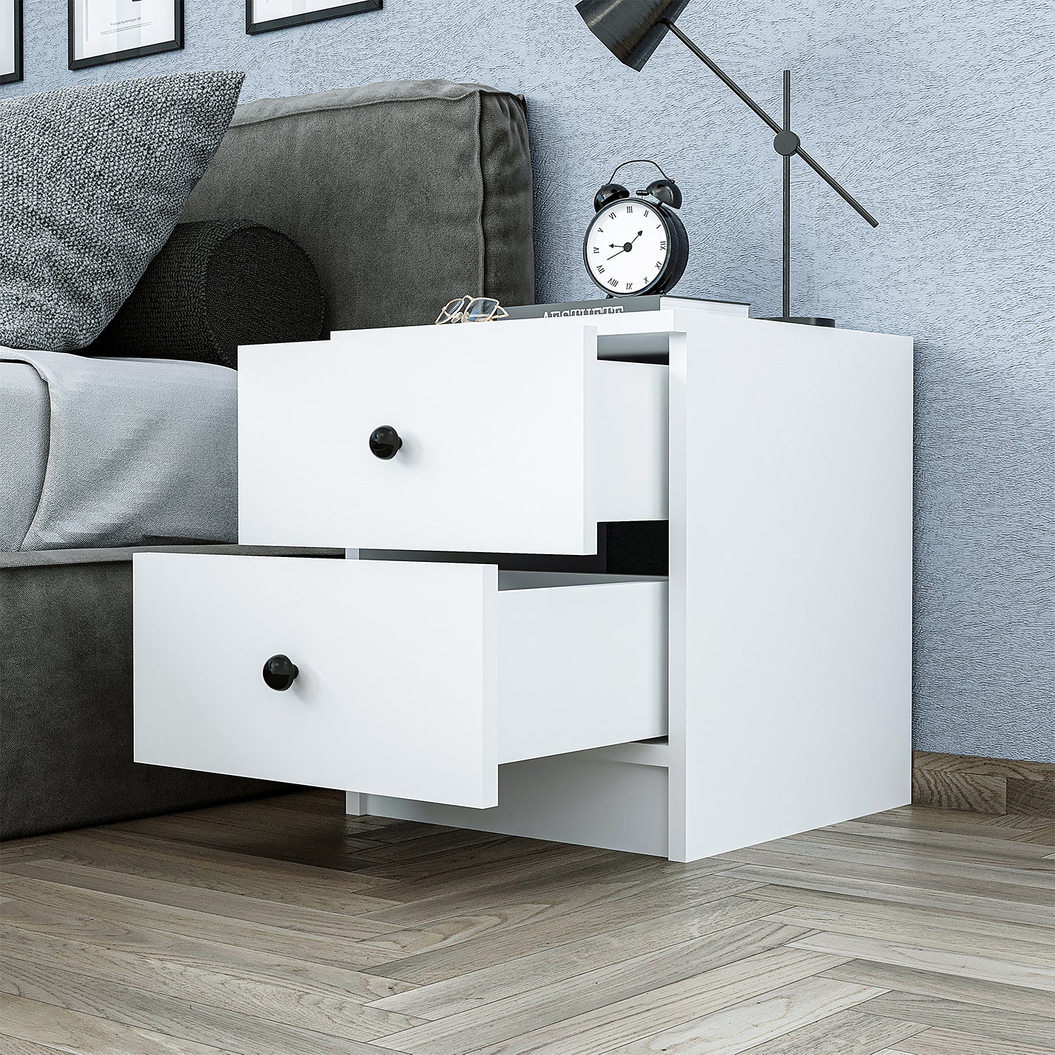 Roomart Komo Beistelltisch mit 2 Schubladen – 40 cm breit, 46,8 cm hoch – Nachttisch & Aufbewahrungstisch für Wohnzimmer, Schlafzimmer oder Büro – Modernes Design- Weiß