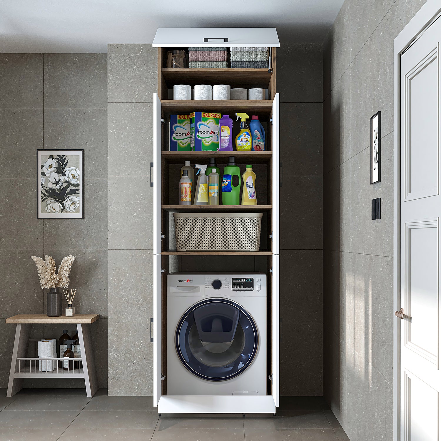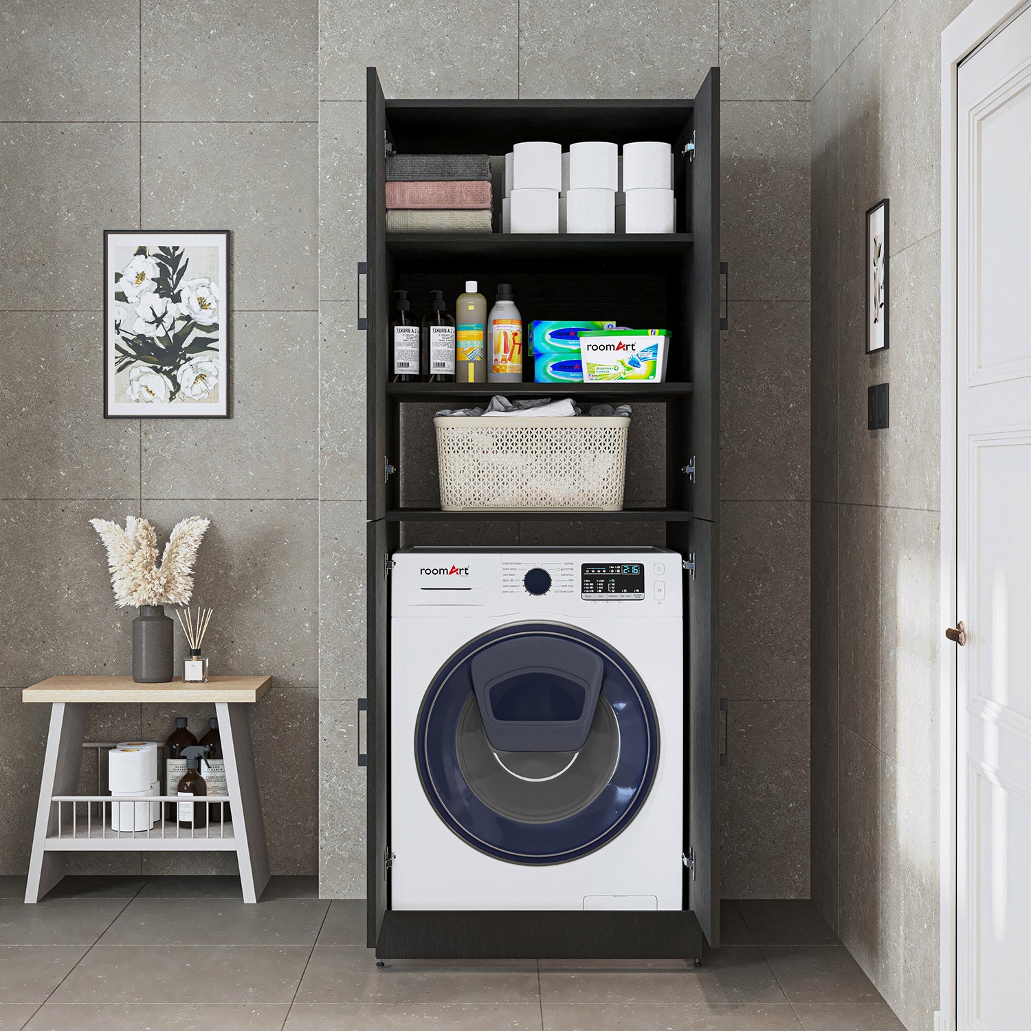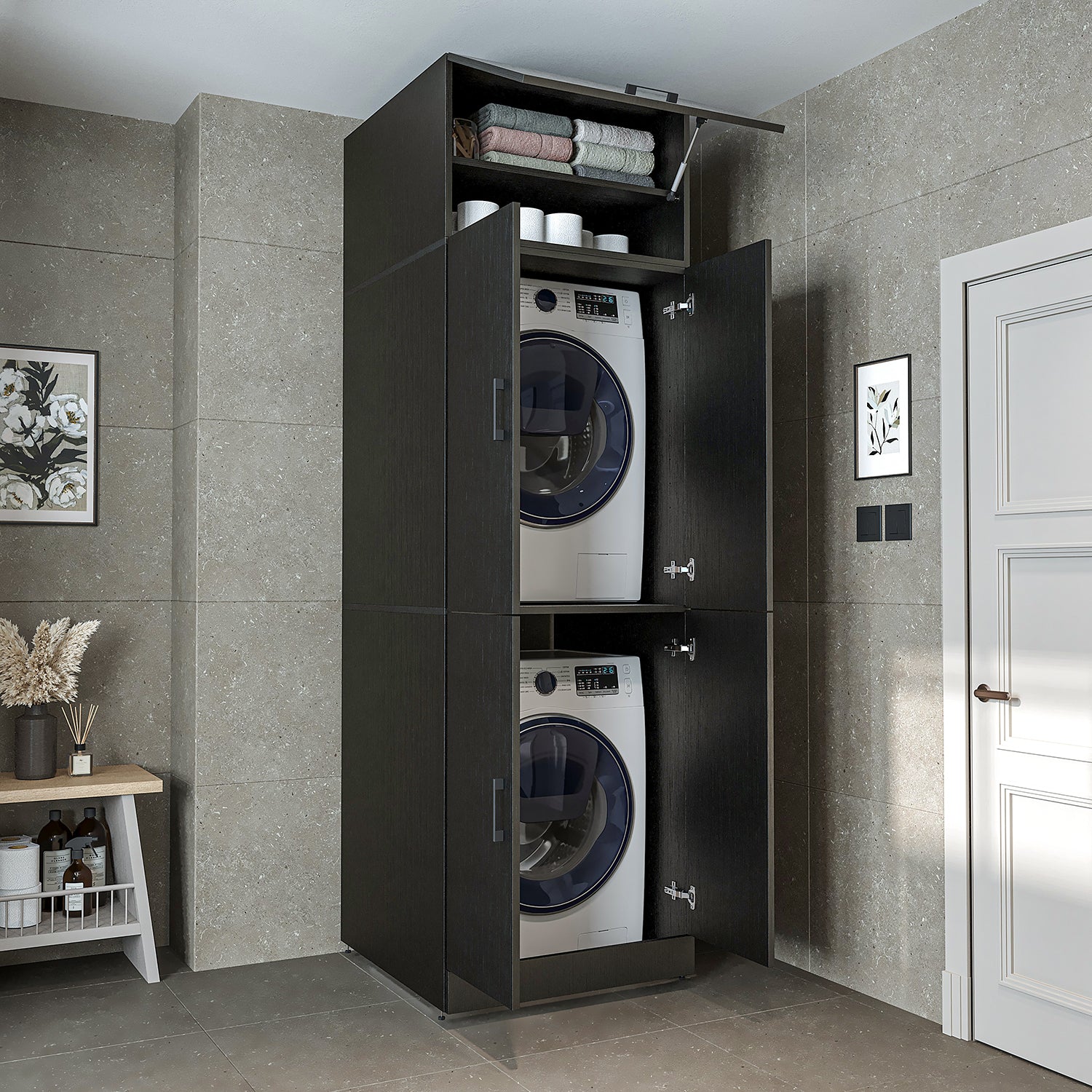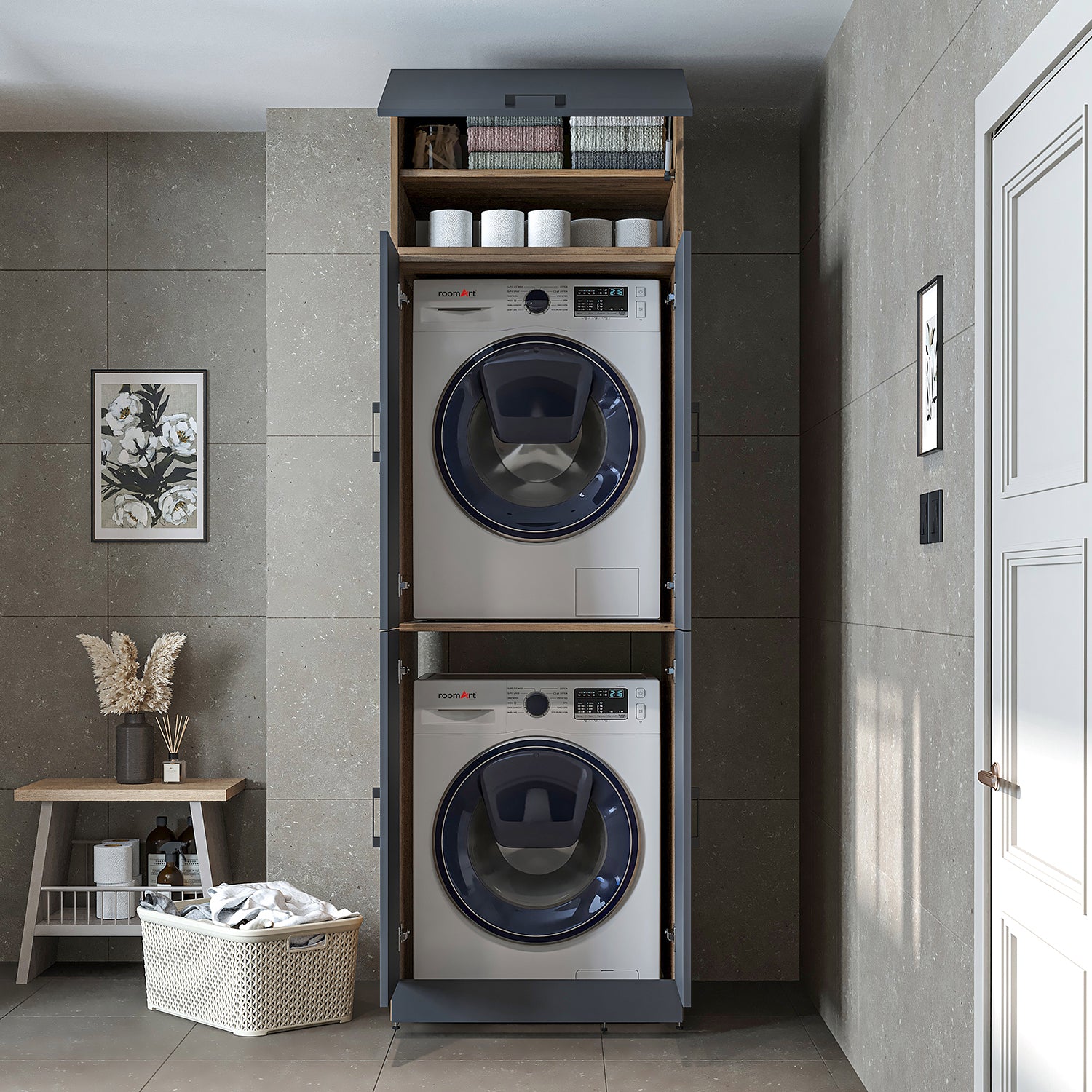 Roomart Waschmaschinenschrank „DORA“ für Waschmaschine & Trockner mit Regalböden, in 5 Farben • Weiß • Weiß Eiche • Anthrazit Eiche • Eiche • Schwarz-Eiche