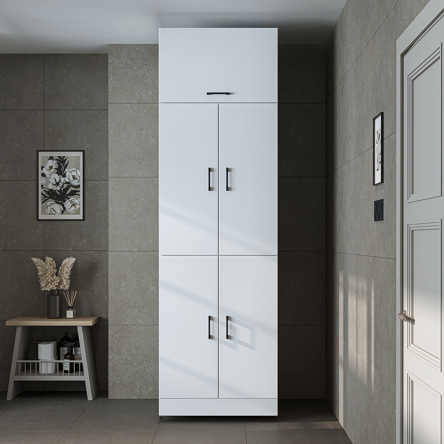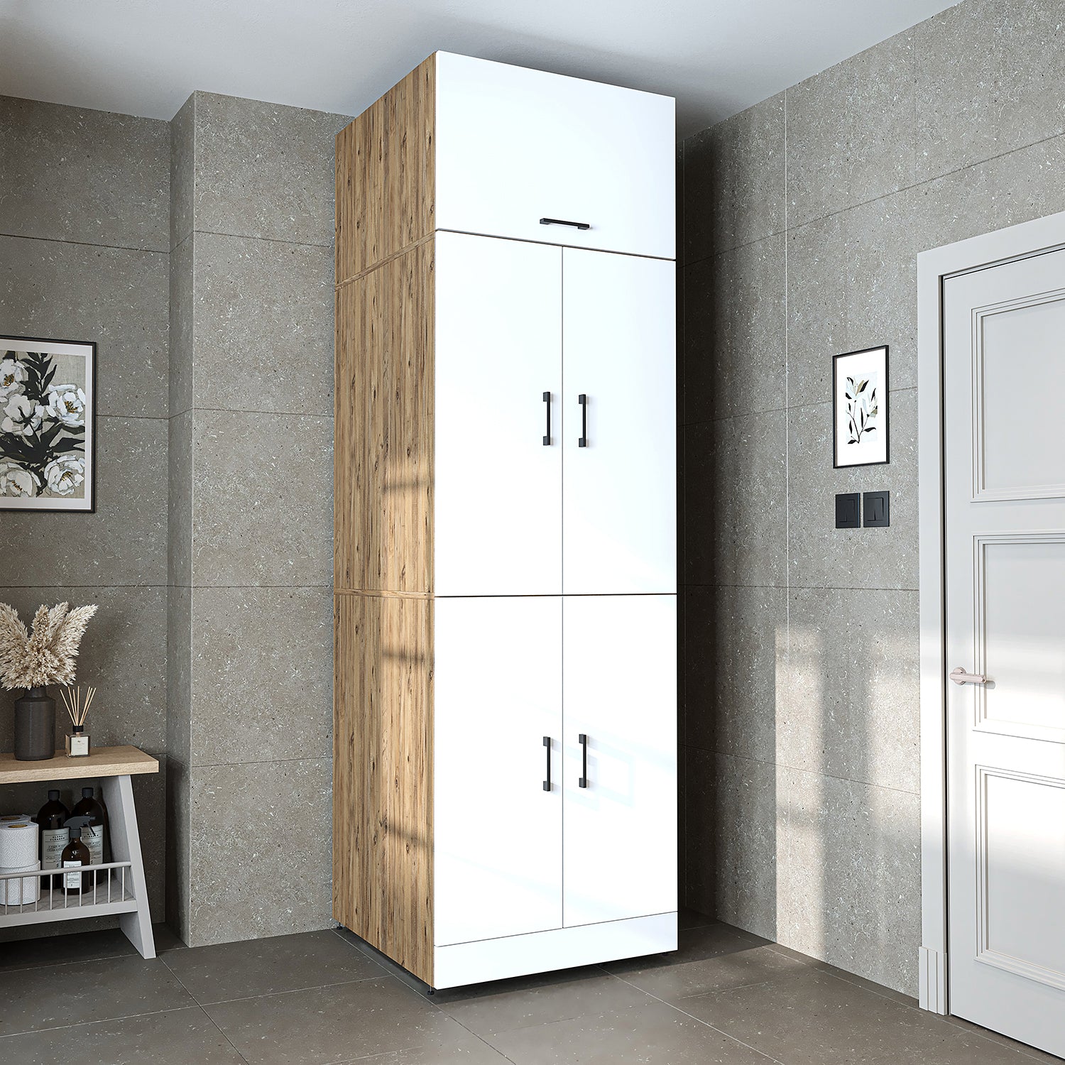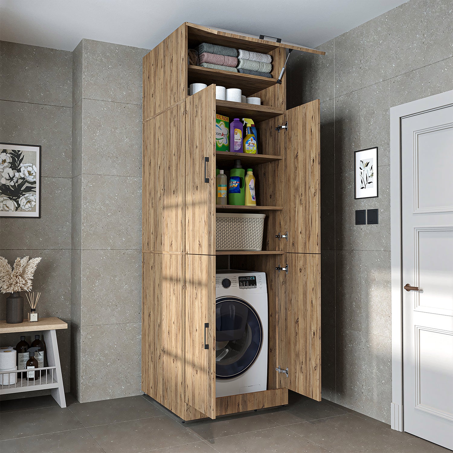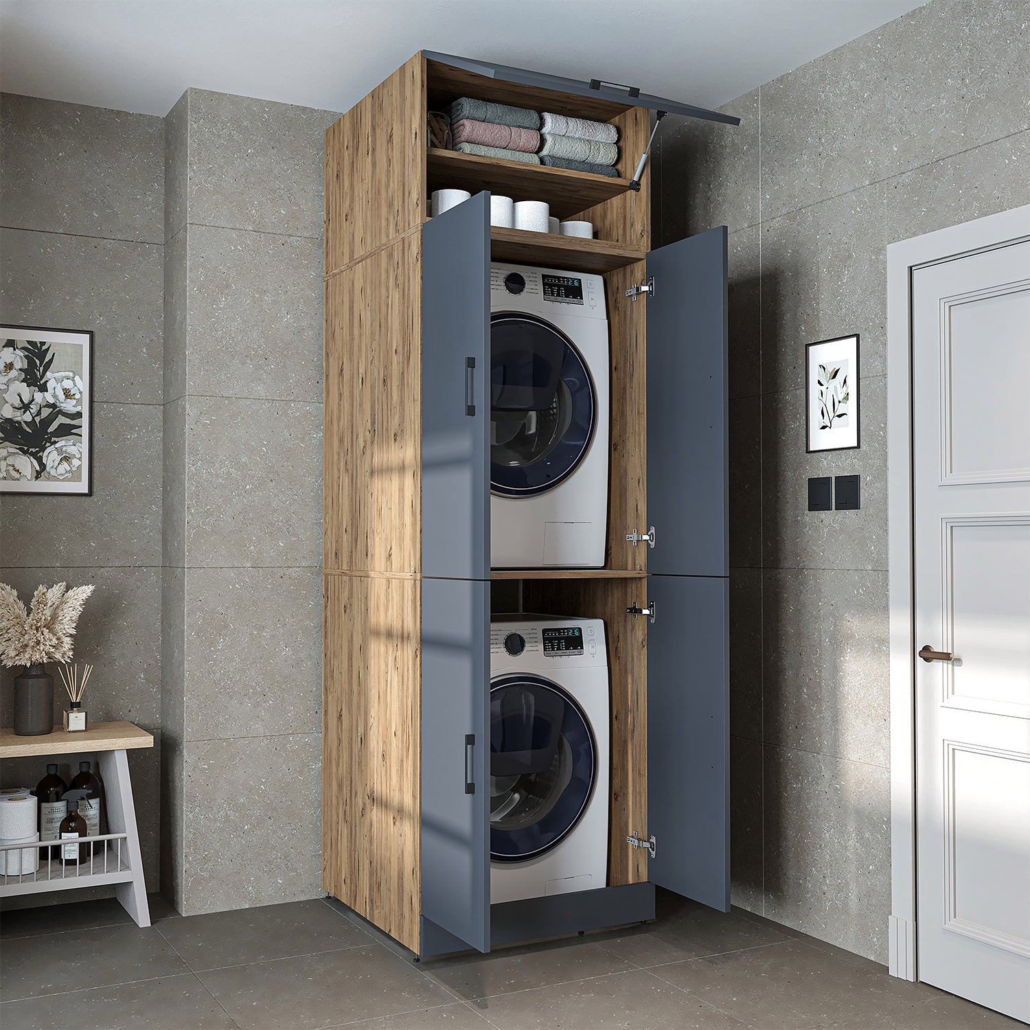 Roomart Waschmaschinenschrank „DORA“ für Waschmaschine & Trockner mit Regalböden, in 5 Farben • Weiß • Weiß Eiche • Anthrazit Eiche • Eiche • Schwarz-Eiche