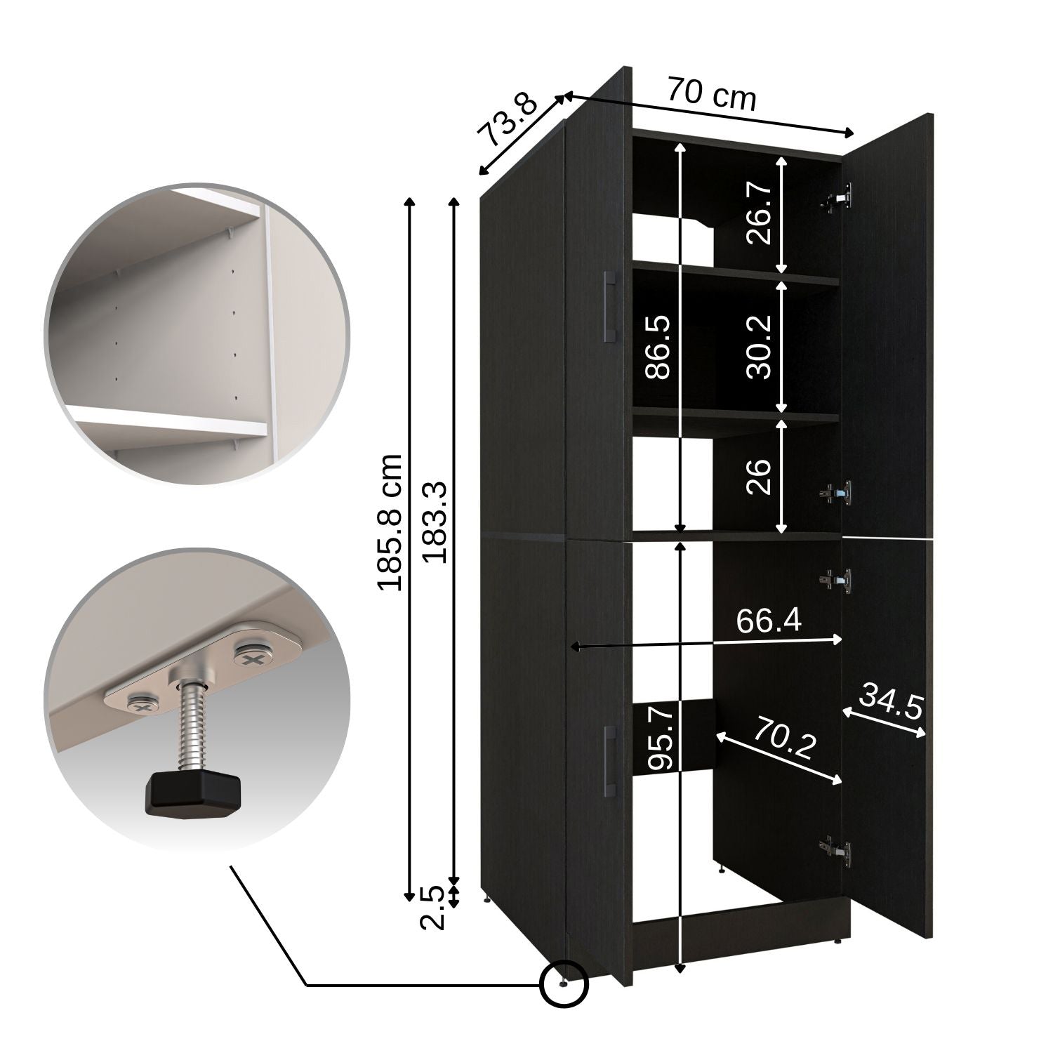 1. Ohne Aufsatzschrank: (B × H × T): 70 × 186 × 73,8 cm
