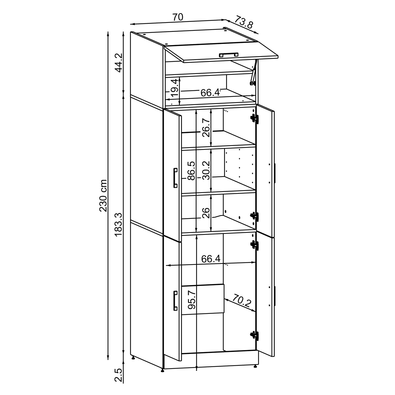 2. Mit Aufsatzschrank: (B × H × T): 70 × 230 × 73,8 cm