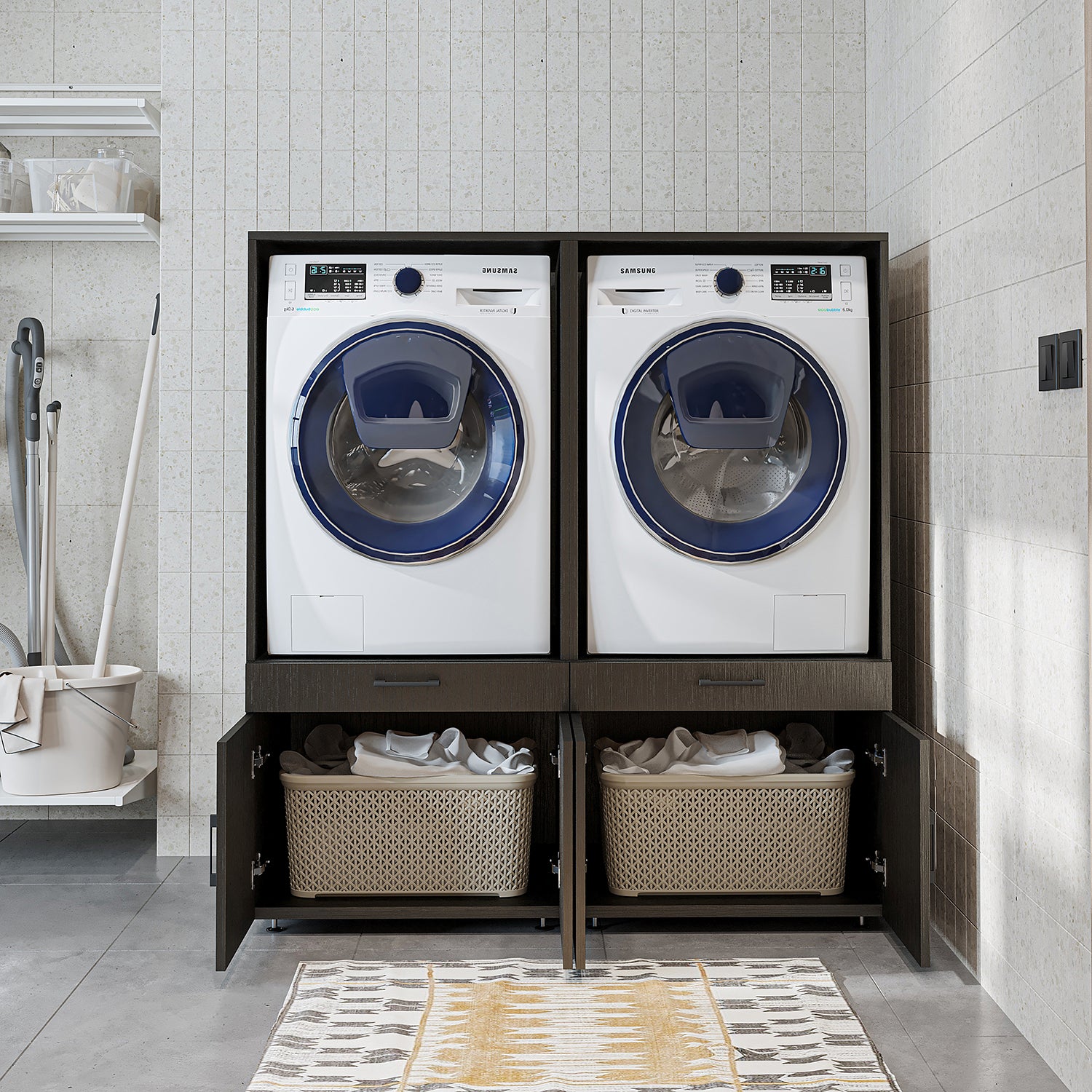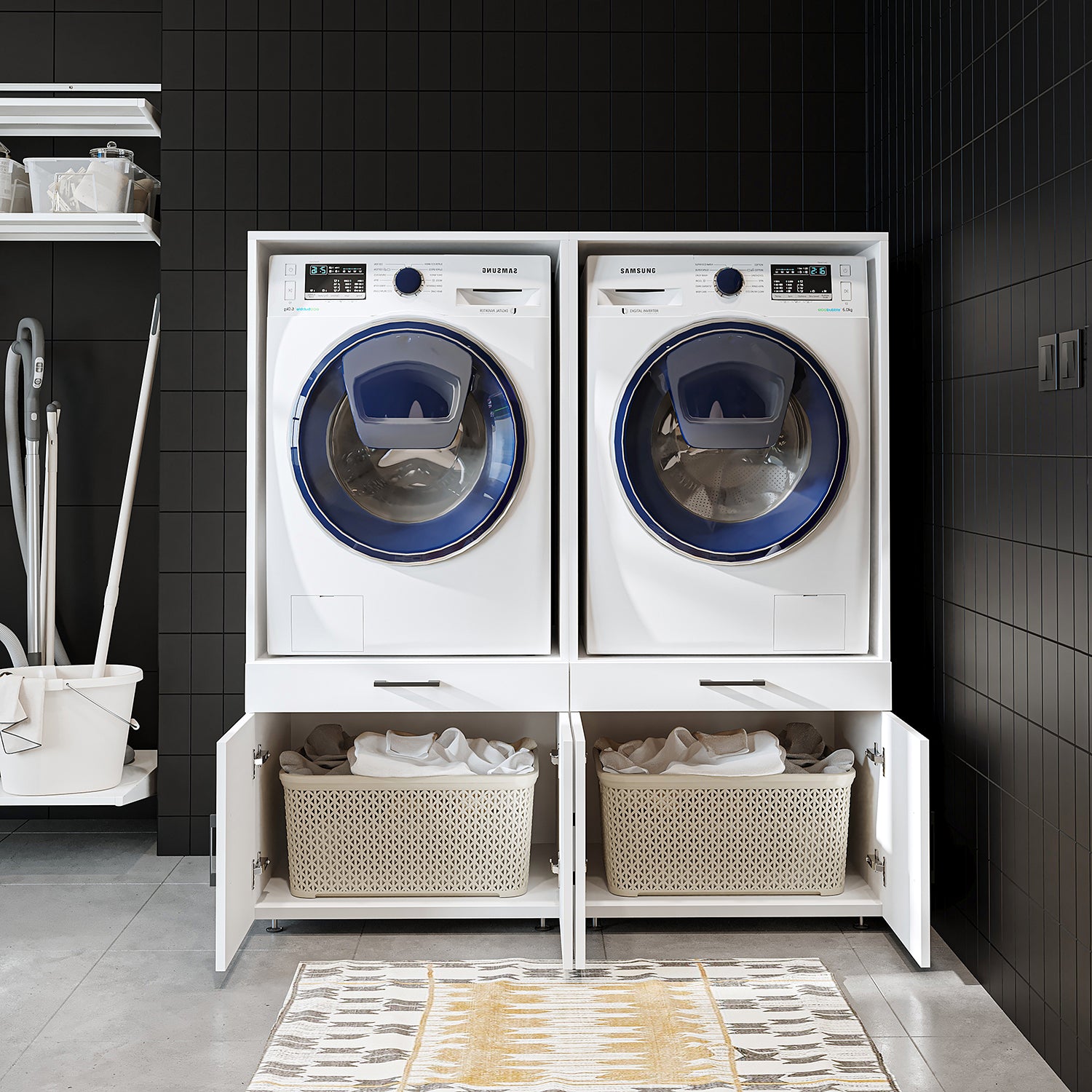 Eine platzsparende und praktische Kombination für Waschküchen mit 2x Waschmachinenüberschrank. Ausziehplatten für Wäschekörbe und Aufbewahrung für Wasch und Putzmittel unter dem Waschmaschine und es hat eine optimale Höhe, die Ihnen die Arbeit für Ihre Wäschen erheblich erleichtert.