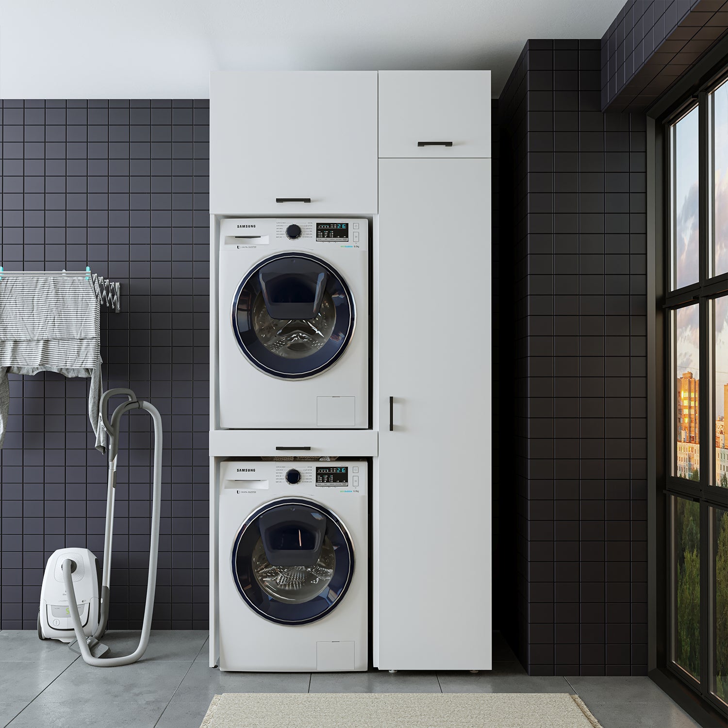 Ideal für Trockner auf Waschmachine mit Klappschrank und Hochschrank inkl. 1x Einlegebode. (Hinzufügen bis zu 5 Regalböden ist möglich). Ausziehbrett für Waschkorb und Hochschrank für extra Stauraum. Es hat eine optimale Höhe, die Ihnen die Arbeit für Ihre Wäschen erheblich erleichtert.
