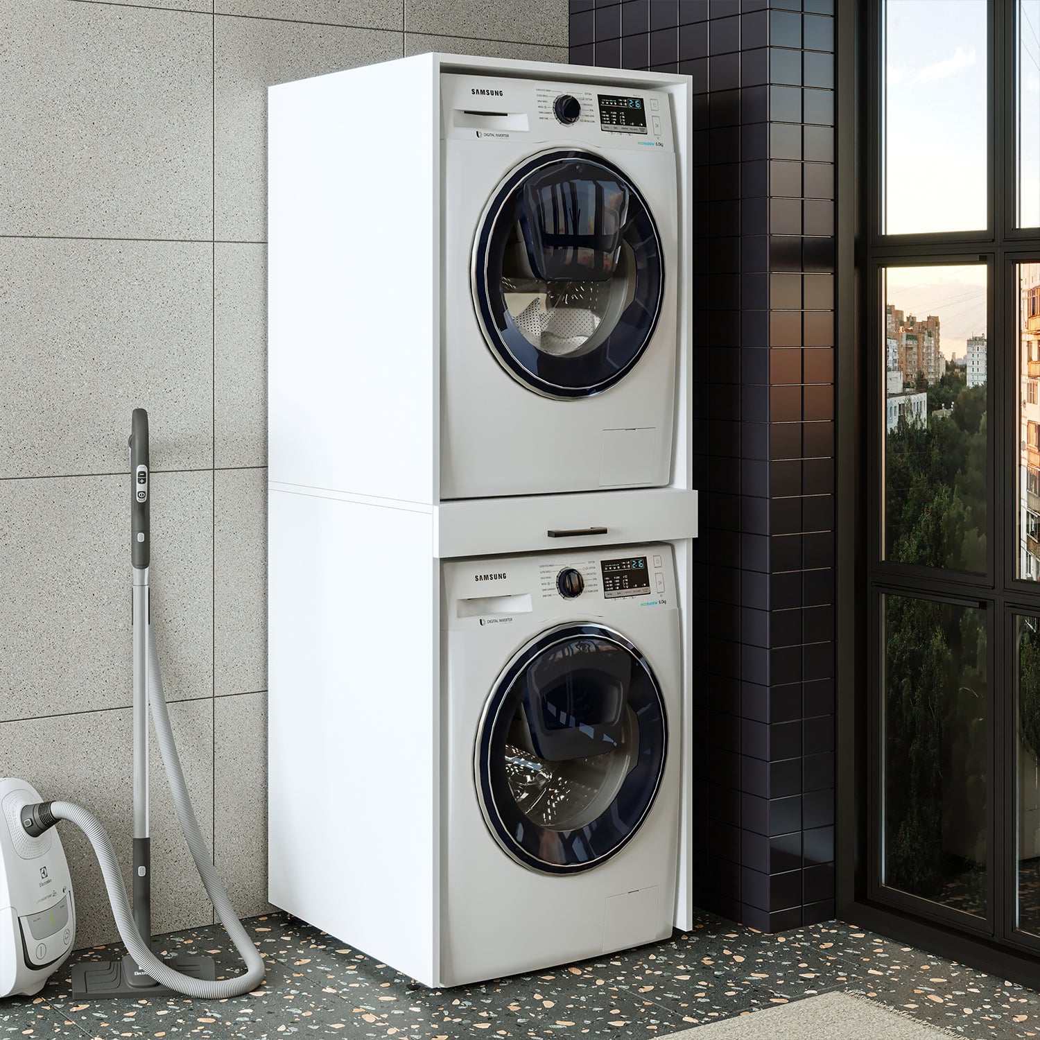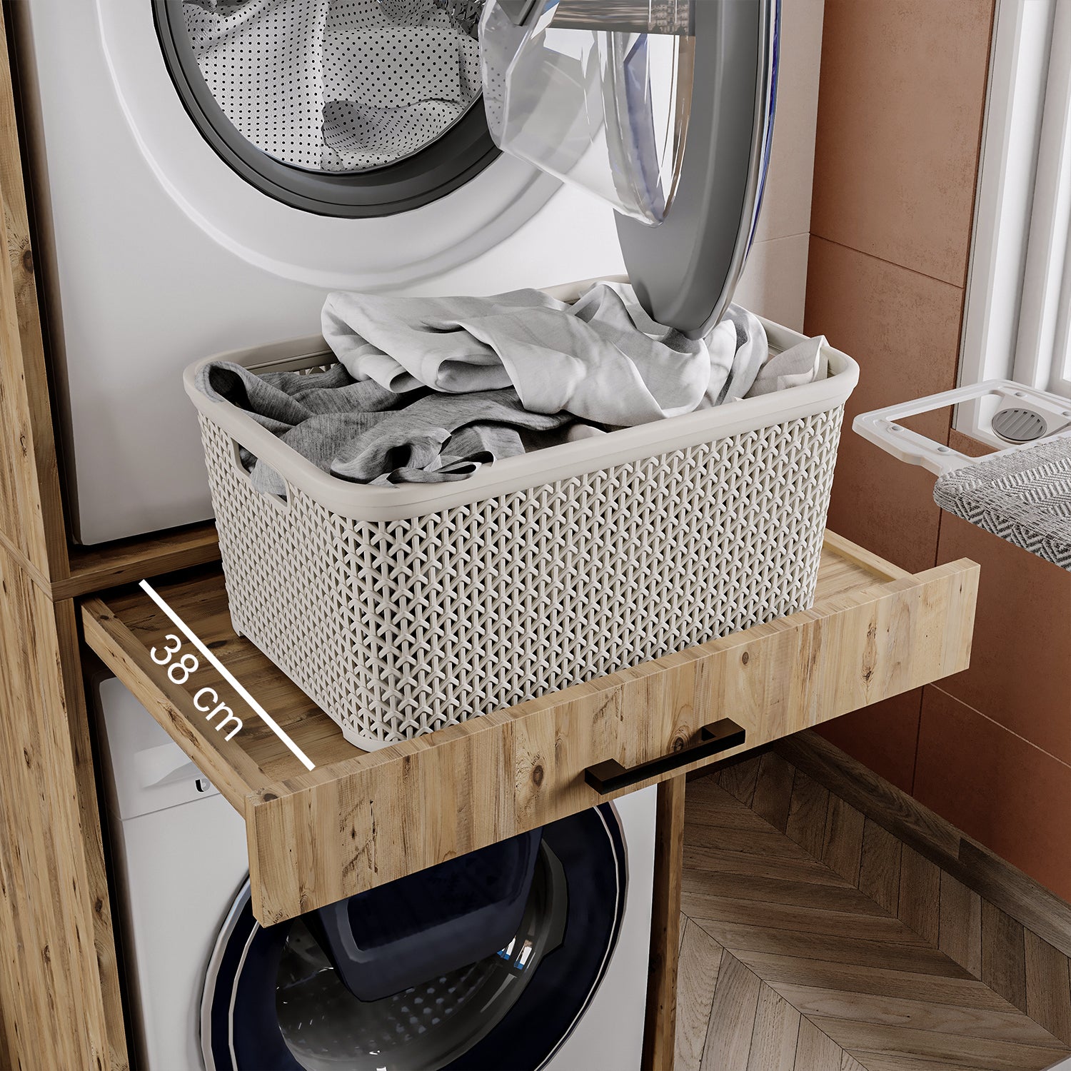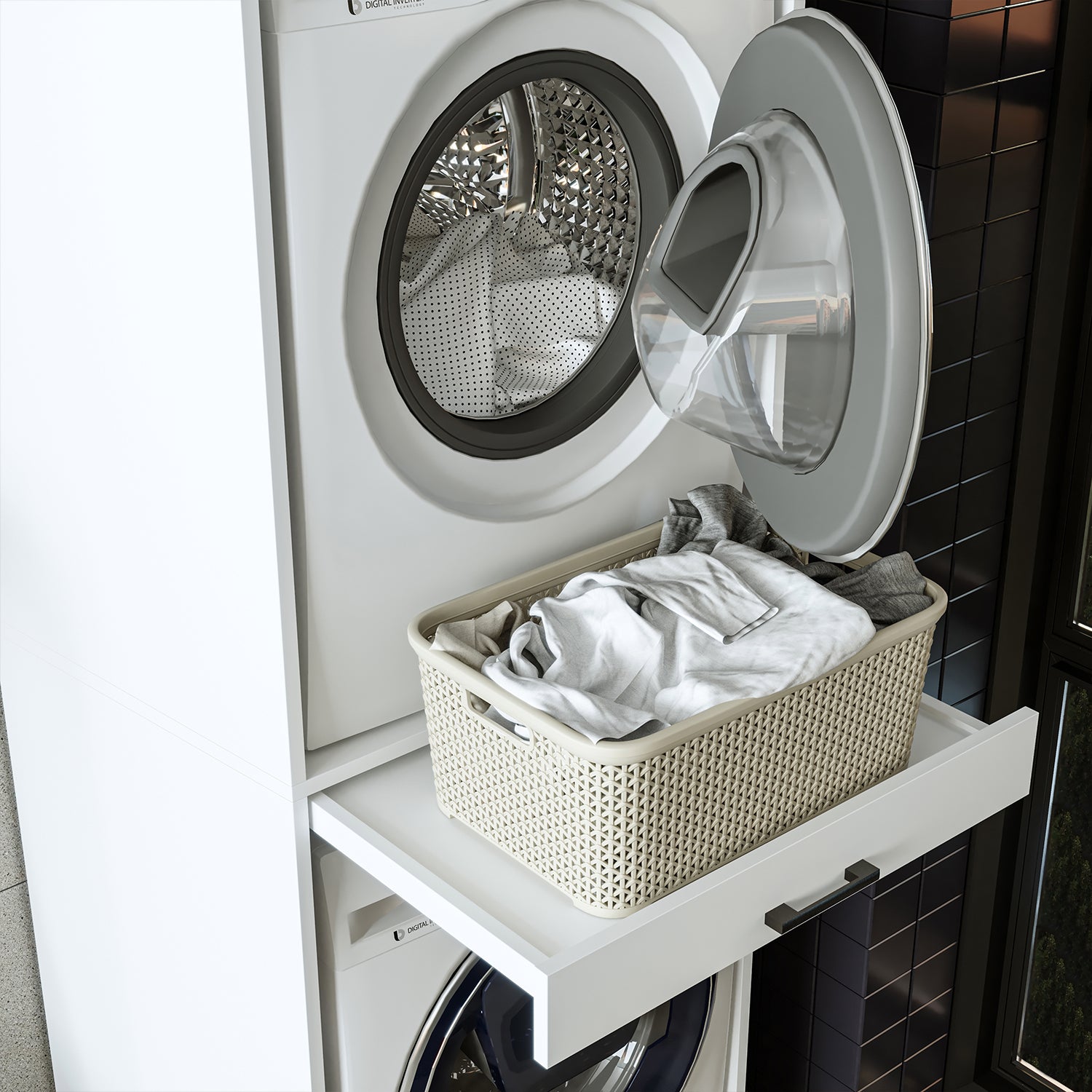 Eine platzsparende und praktische Kombination für Trockner auf Waschmachine mit Klappschrank (3 option ist verfügbar - 20 cm,29 cm und 55cm hoch) Ausziehplatte für Waschkorb und Hochschrank für extra Stauraum. Es hat eine optimale Höhe, die Ihnen die Arbeit für Ihre Wäschen erheblich erleichtert.