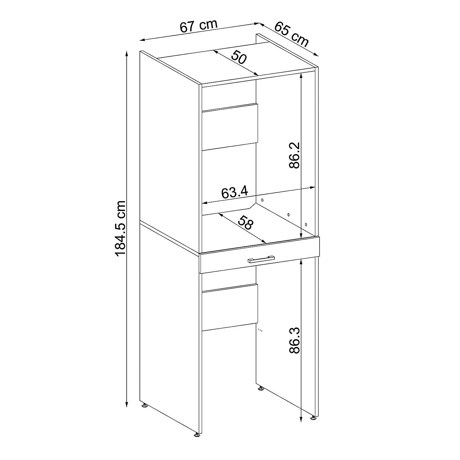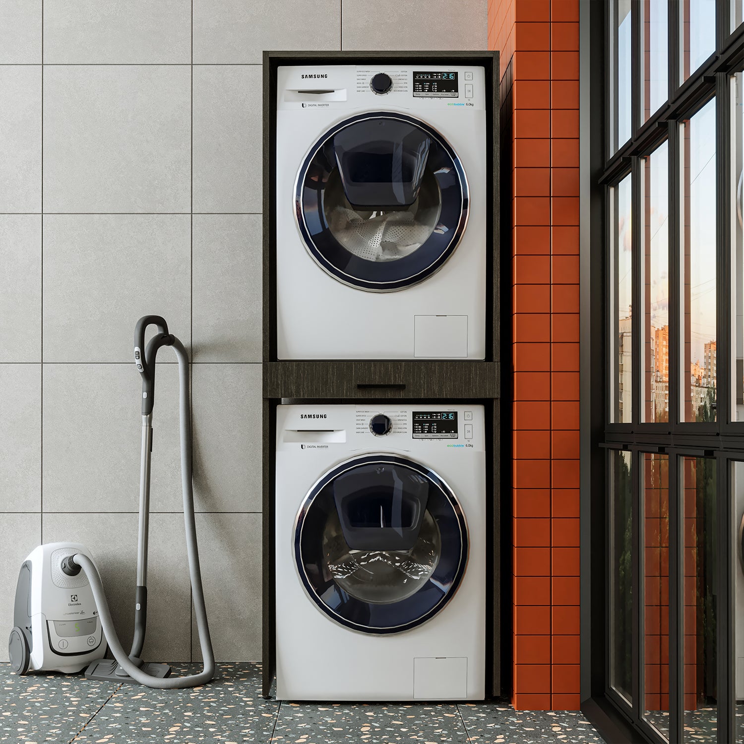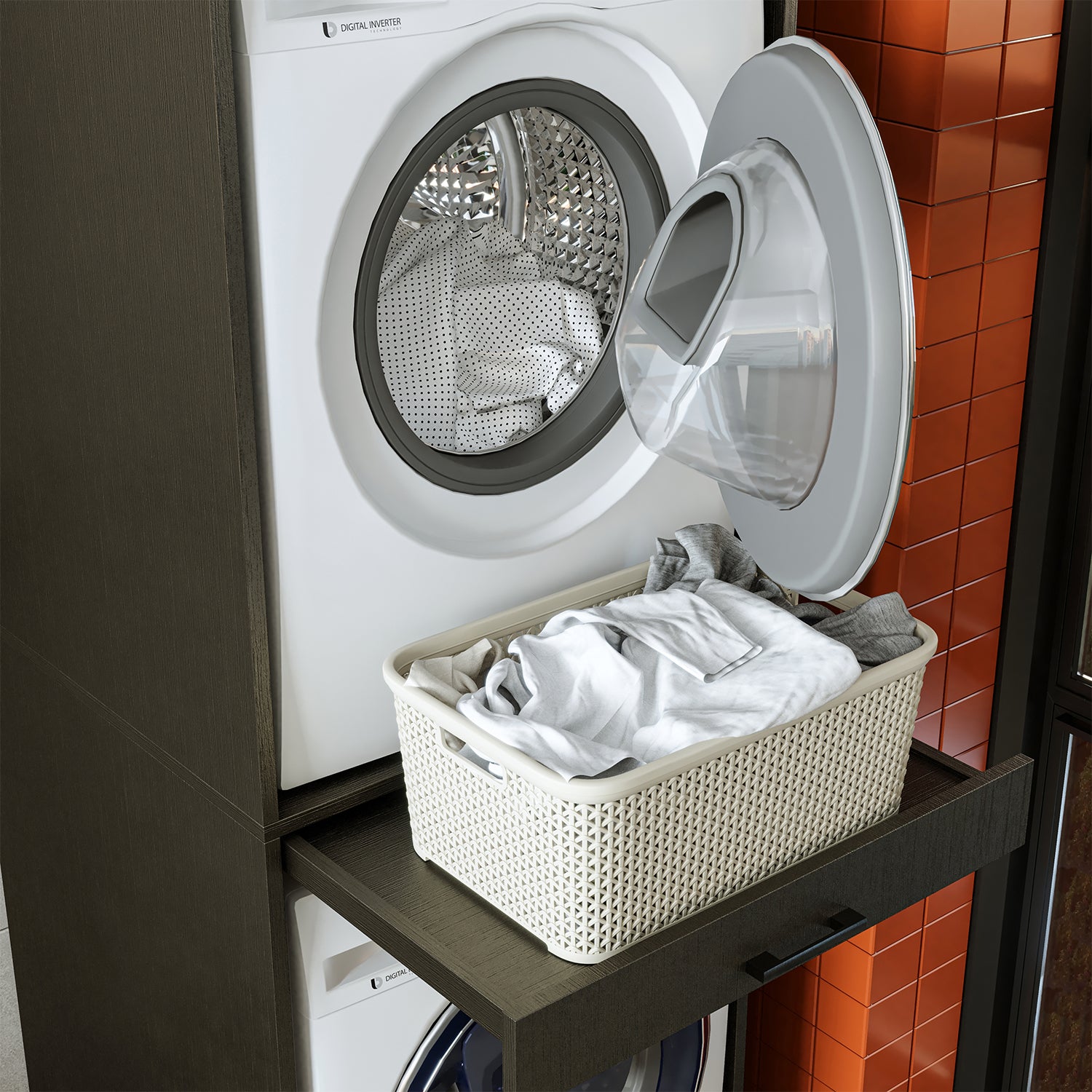 Eine platzsparende und praktische Kombination für Trockner auf Waschmachine mit Klappschrank (3 option ist verfügbar - 20 cm,29 cm und 55cm hoch) Ausziehplatte für Waschkorb und Hochschrank für extra Stauraum. Es hat eine optimale Höhe, die Ihnen die Arbeit für Ihre Wäschen erheblich erleichtert.