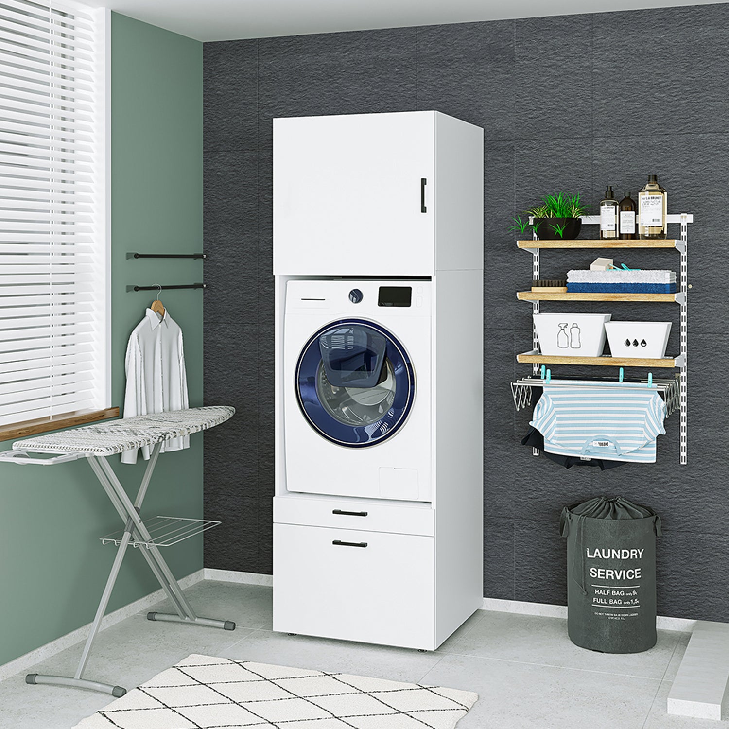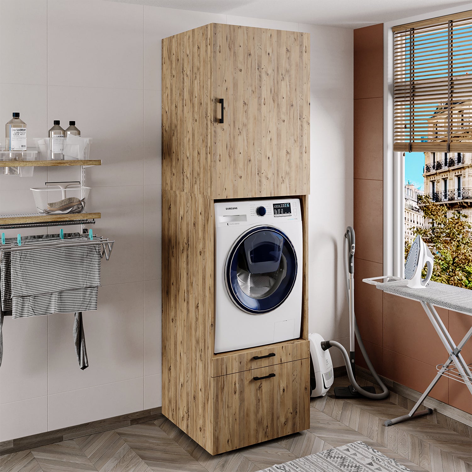 Roomart Waschmaschinenschrank mit Schrankaufsatz • mit Ausziehbrett • Weiß • Schwarz eiche • Eiche