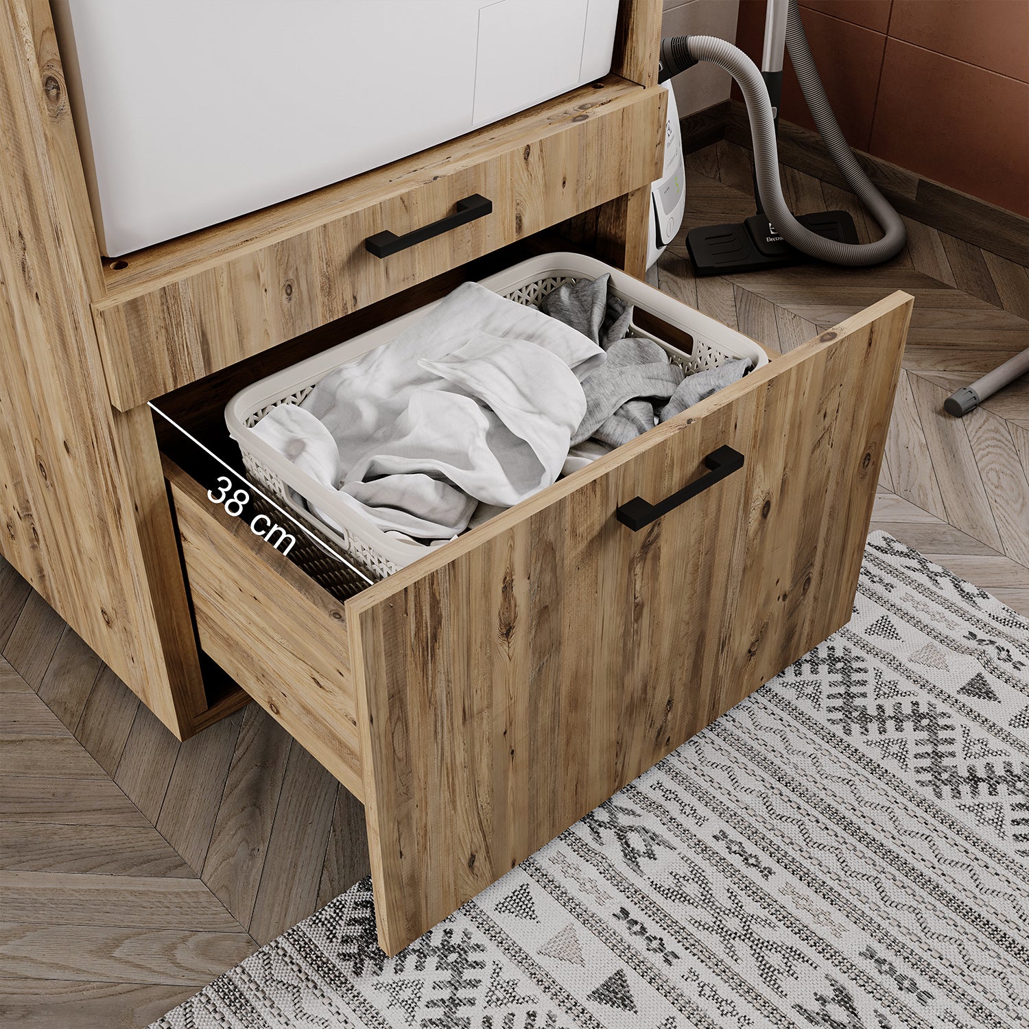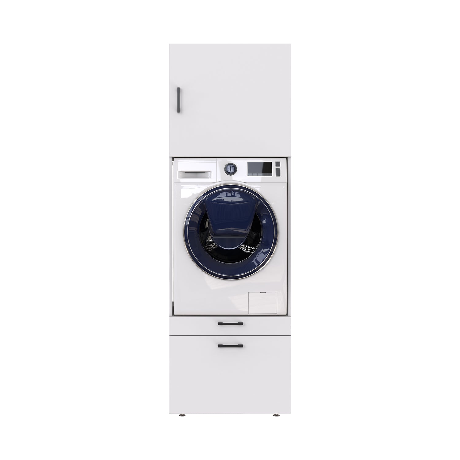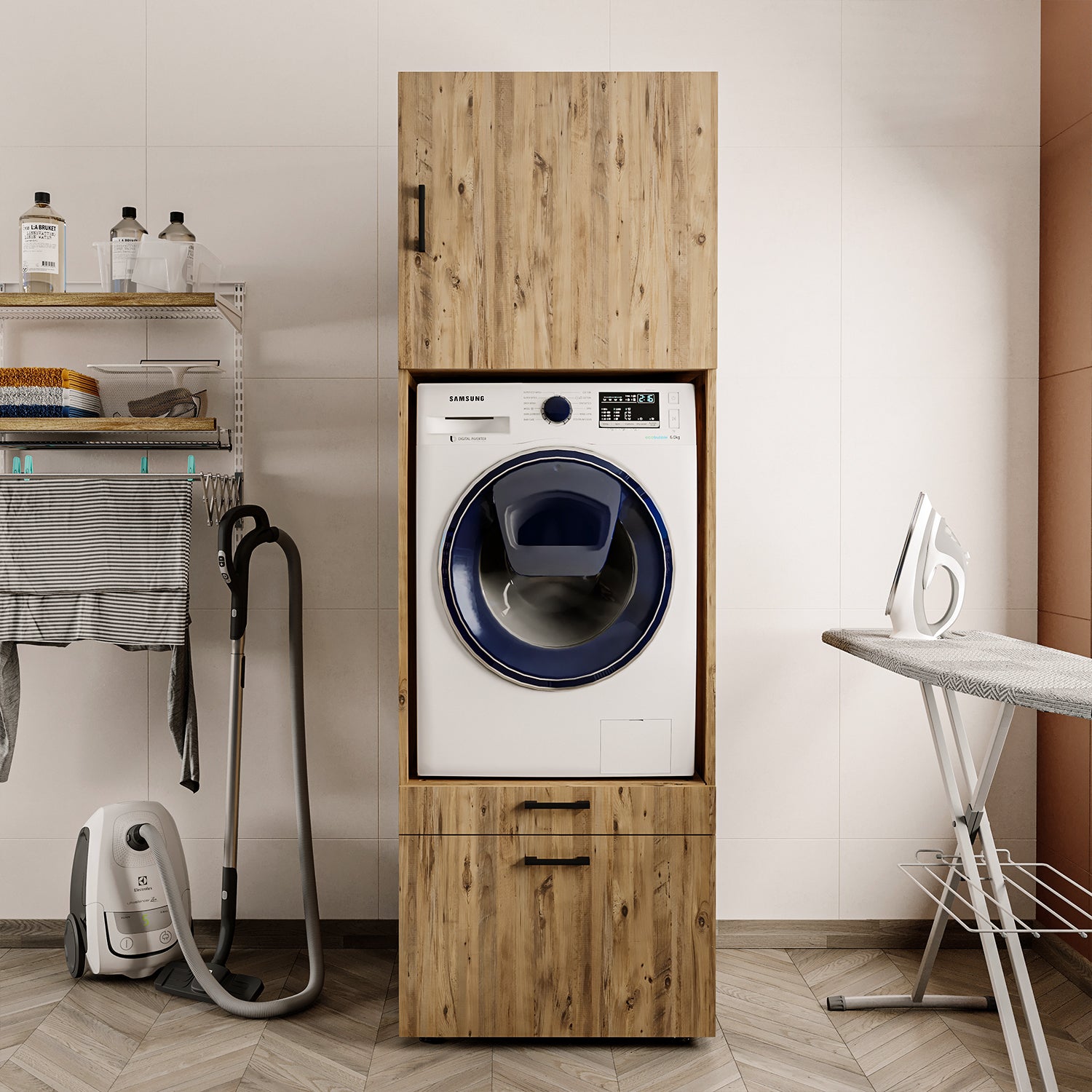 Eine platzsparende und praktische Kombination für Waschküchen mit einem Waschmaschinenschrank und einem 62 cm oder 87 cm Schrankaufsatz. Unter der Waschmaschine befinden sich ein Auszug für einen Wäschekorb und eine Schublade zur Aufbewahrung von Wasch- und Reinigungsmitteln. Diese befindet sich in optimaler Höhe und erleichtert Ihnen das Wäschewaschen erheblich.