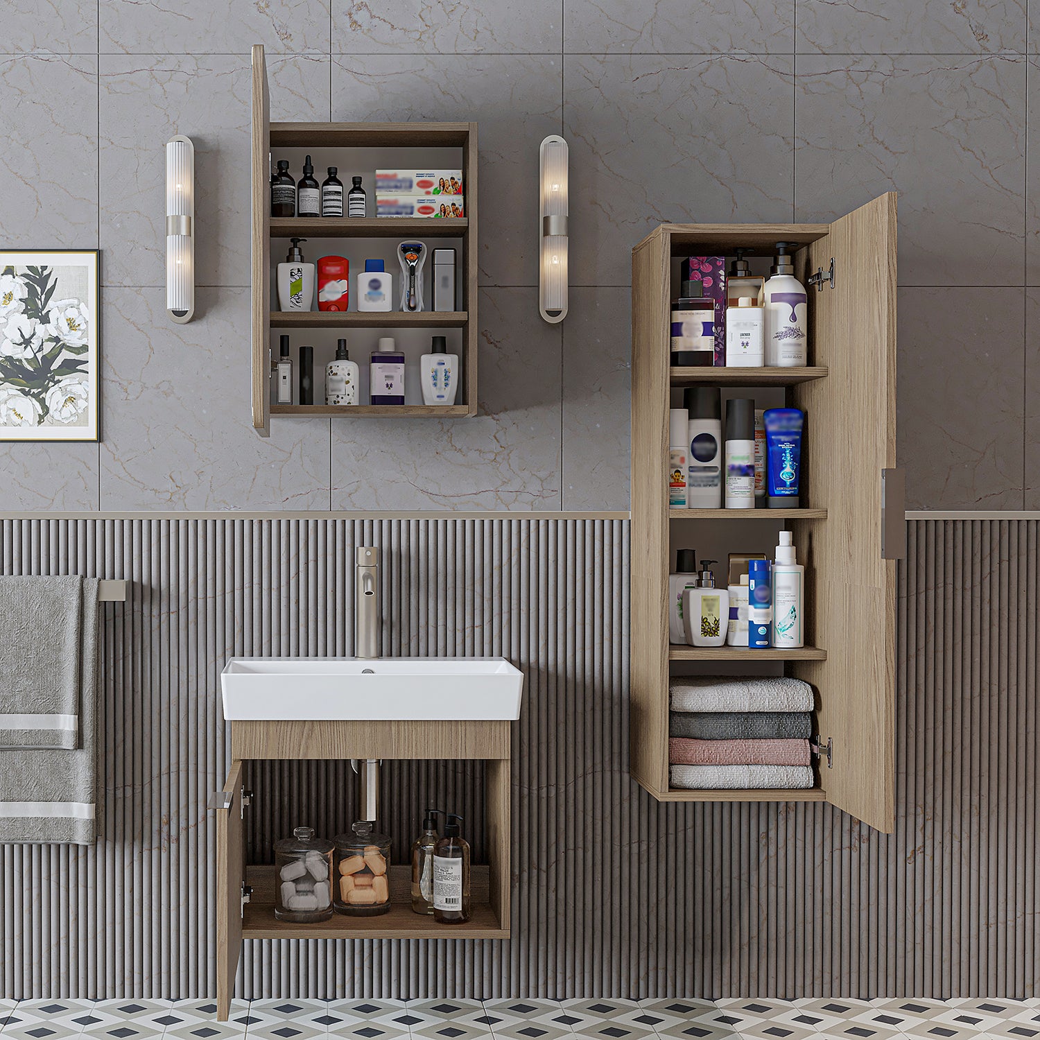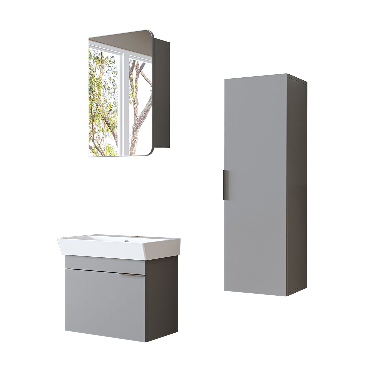 Das Badmöbel-Set überzeugt durch eine harmonische Kombination aus Waschbeckenunterschrank, Keramik-Waschbecken, Spiegelschrank und Hochschrank und sorgt für Ordnung auf kompakter Fläche.