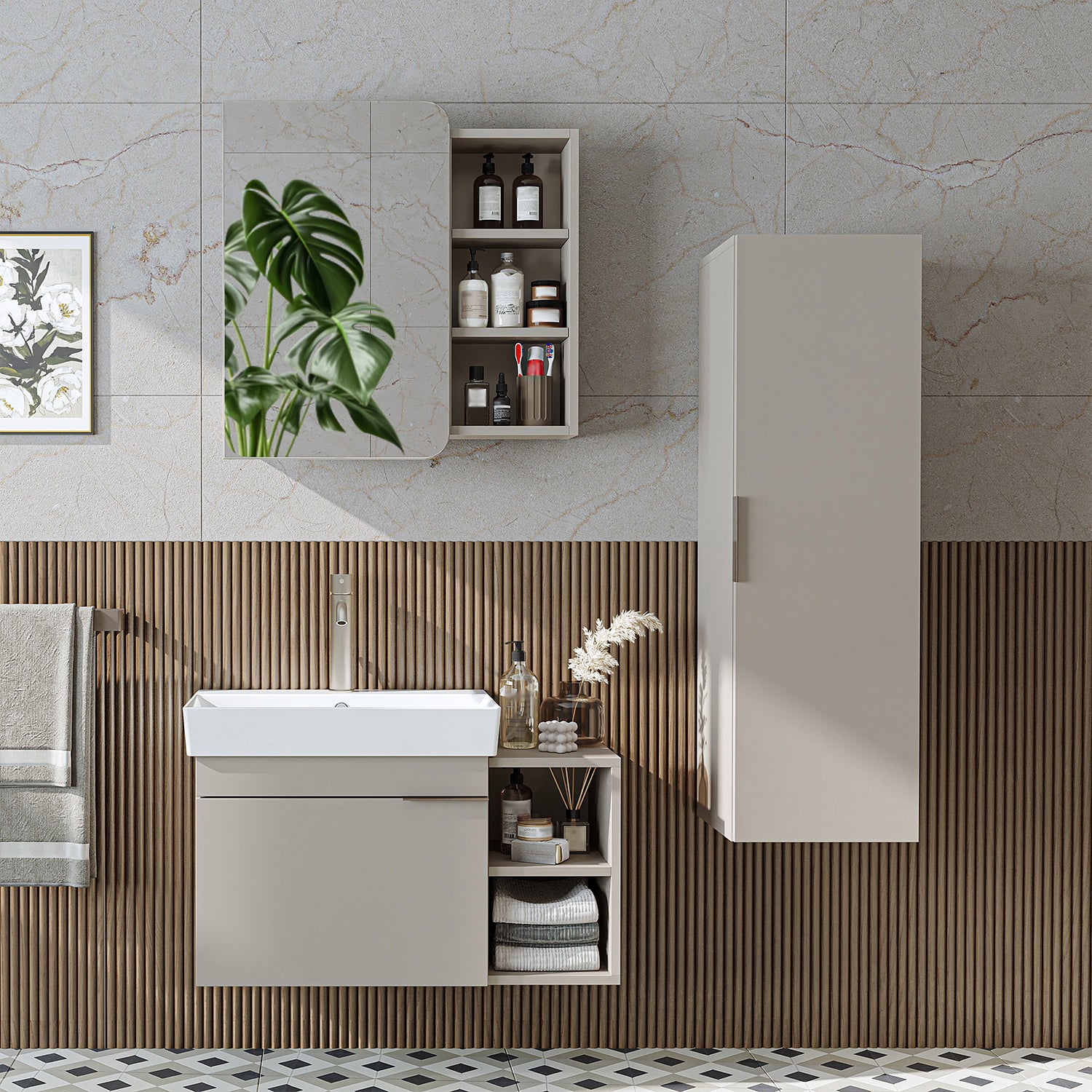 Das Badmöbel-Set überzeugt durch eine harmonische Kombination aus Waschbeckenunterschrank, Keramik-Waschbecken, Spiegelschrank und Hochschrank und sorgt für Ordnung auf kompakter Fläche.