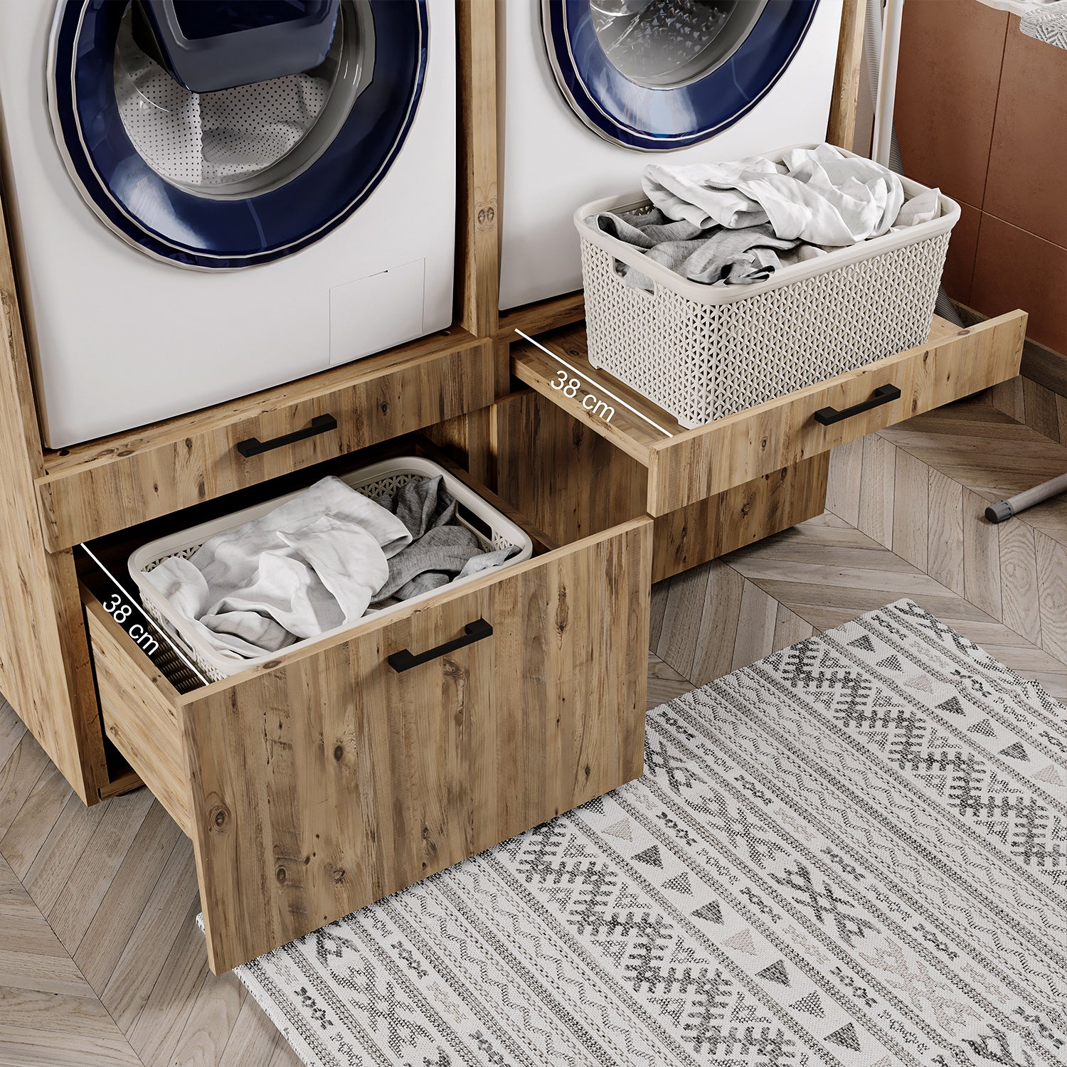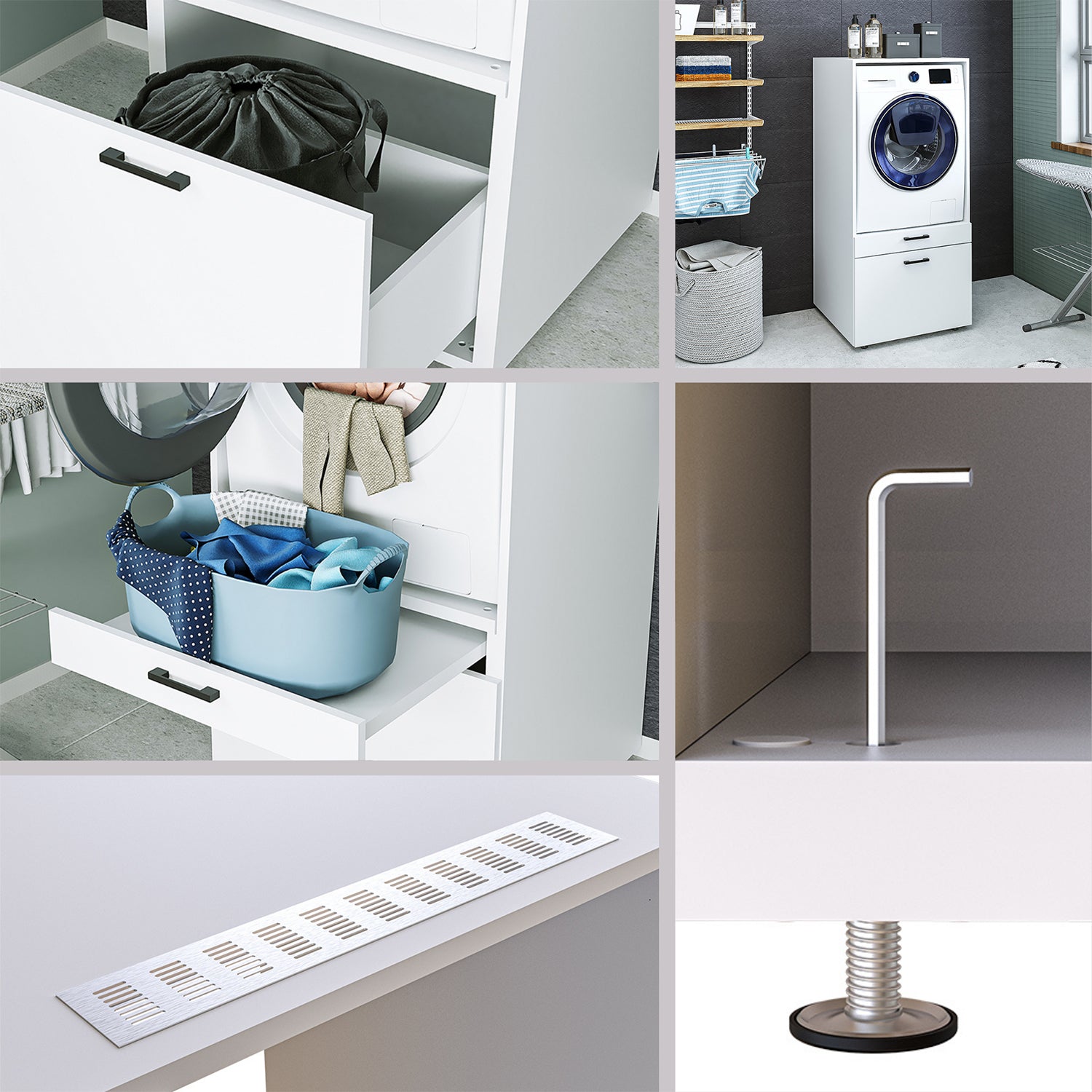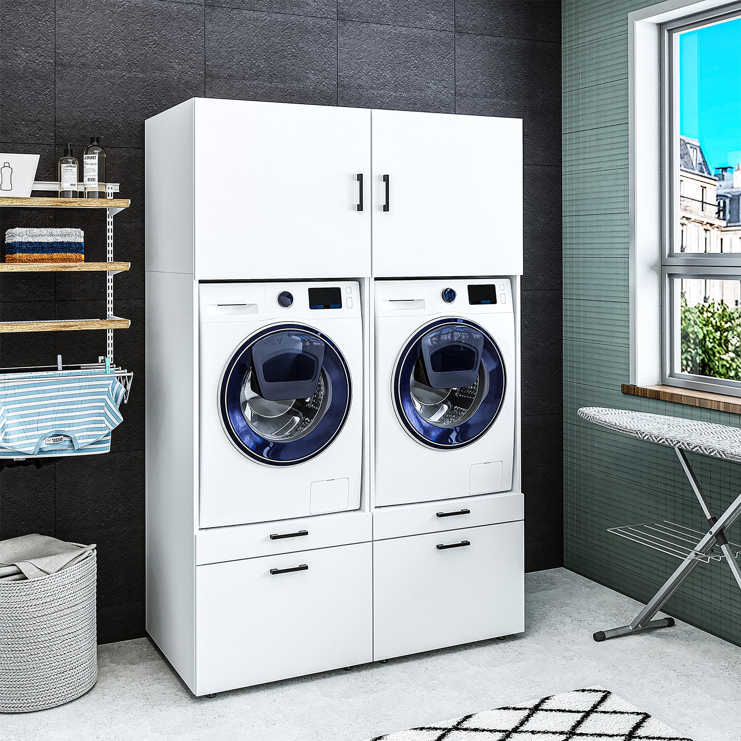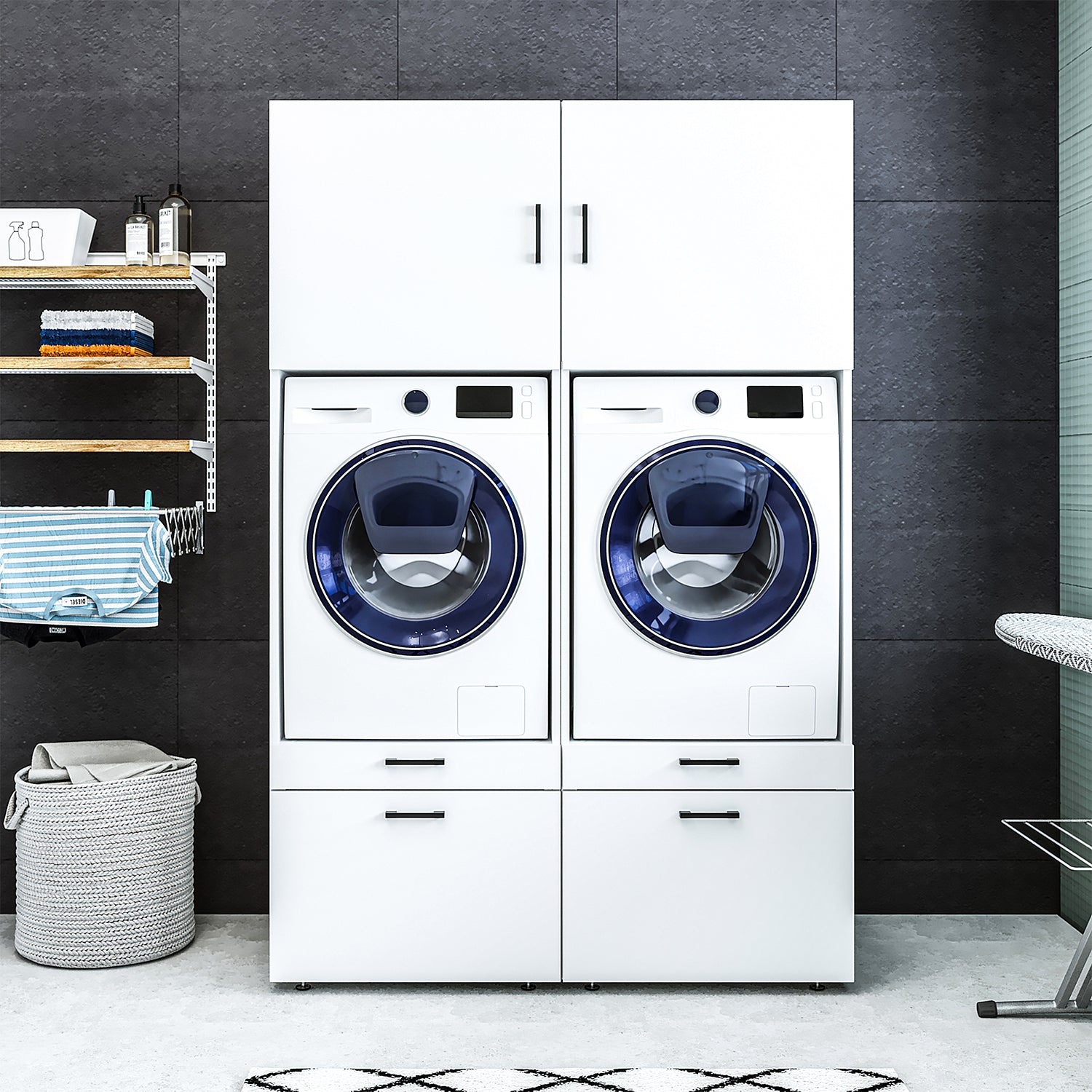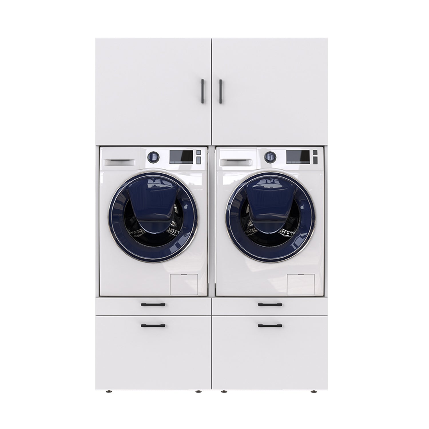 Eine platzsparende und praktische Kombination für Waschküchen mit 2 mal Waschmachinenüberschrank mit Schubladen und 2 Shrankaufsätze. Ausziehbrett für Waschkorb und Aufbewahrung für Wasch und Putzmittel unter dem Waschmaschine und es hat eine optimale Höhe, die Ihnen die Arbeit für Ihre Wäschen erheblich erleichtert.