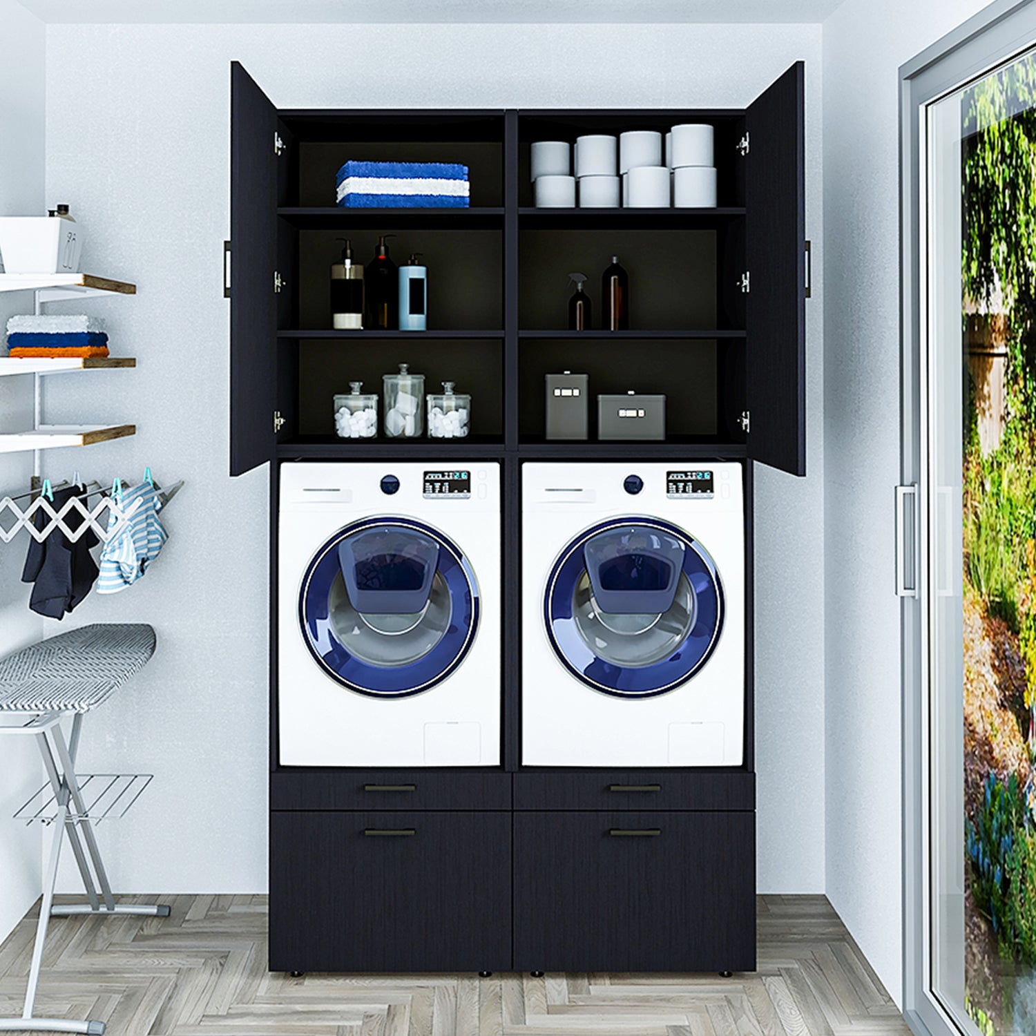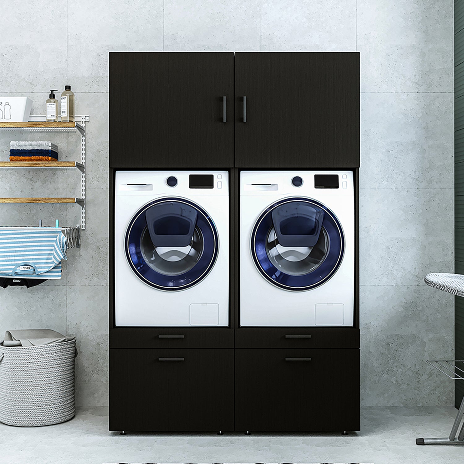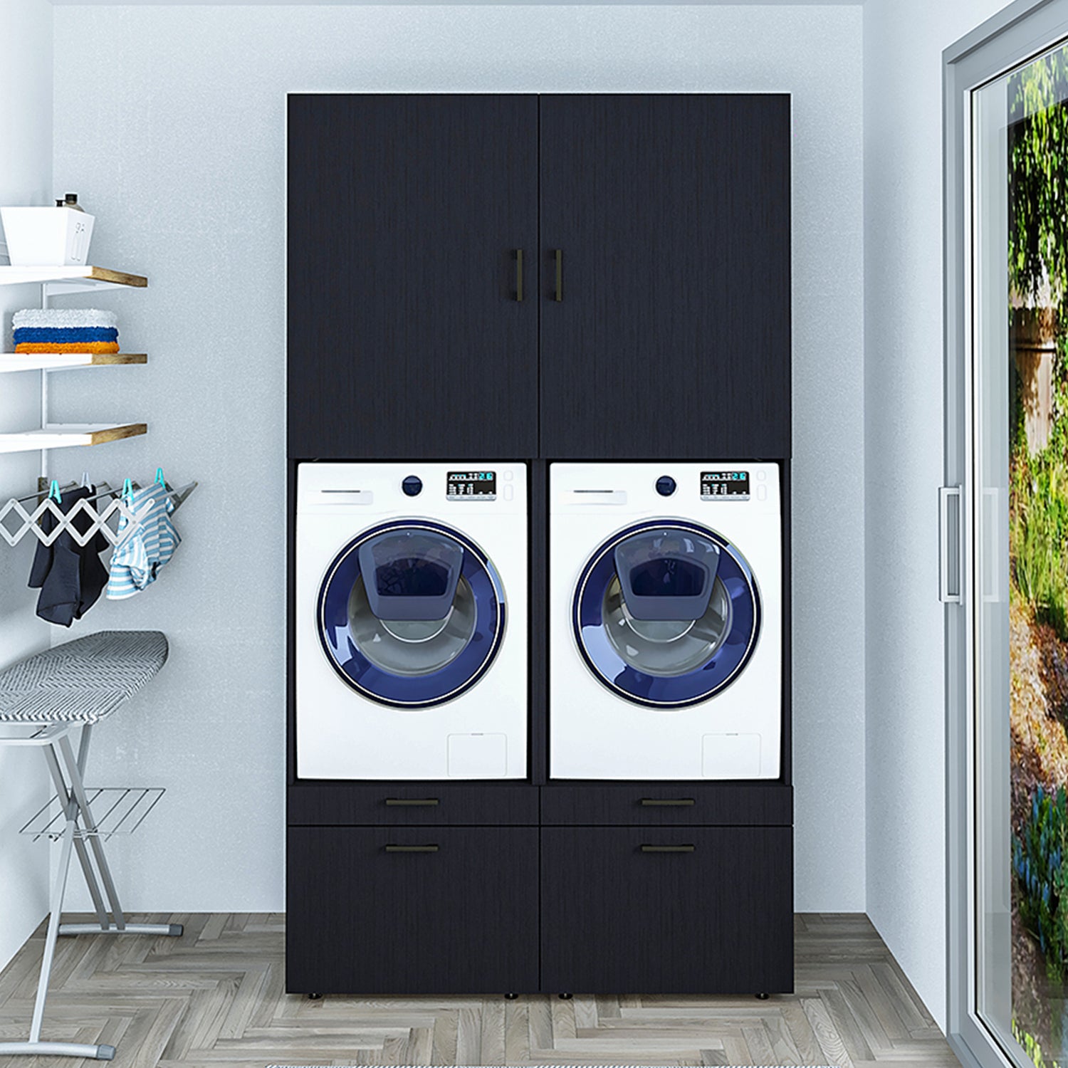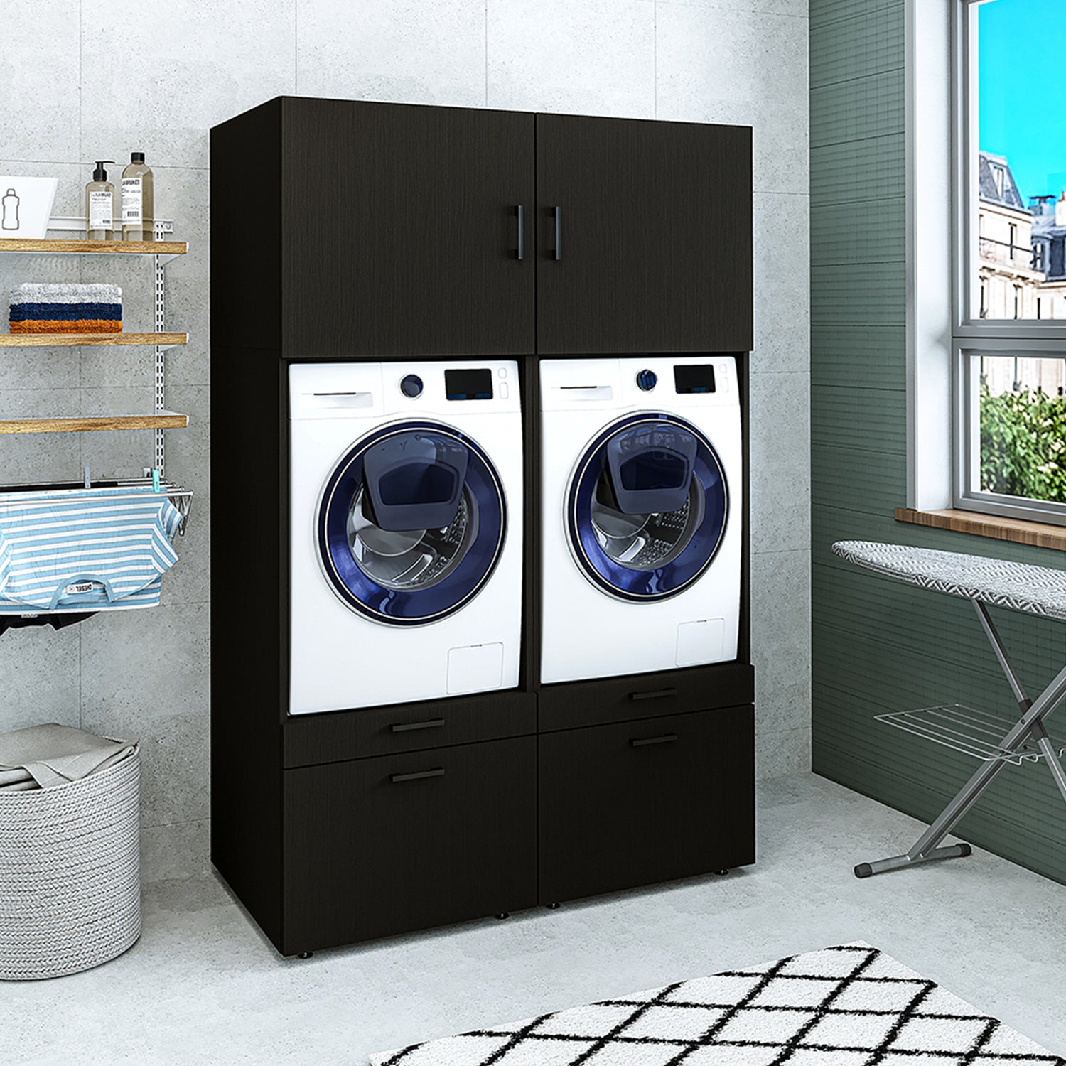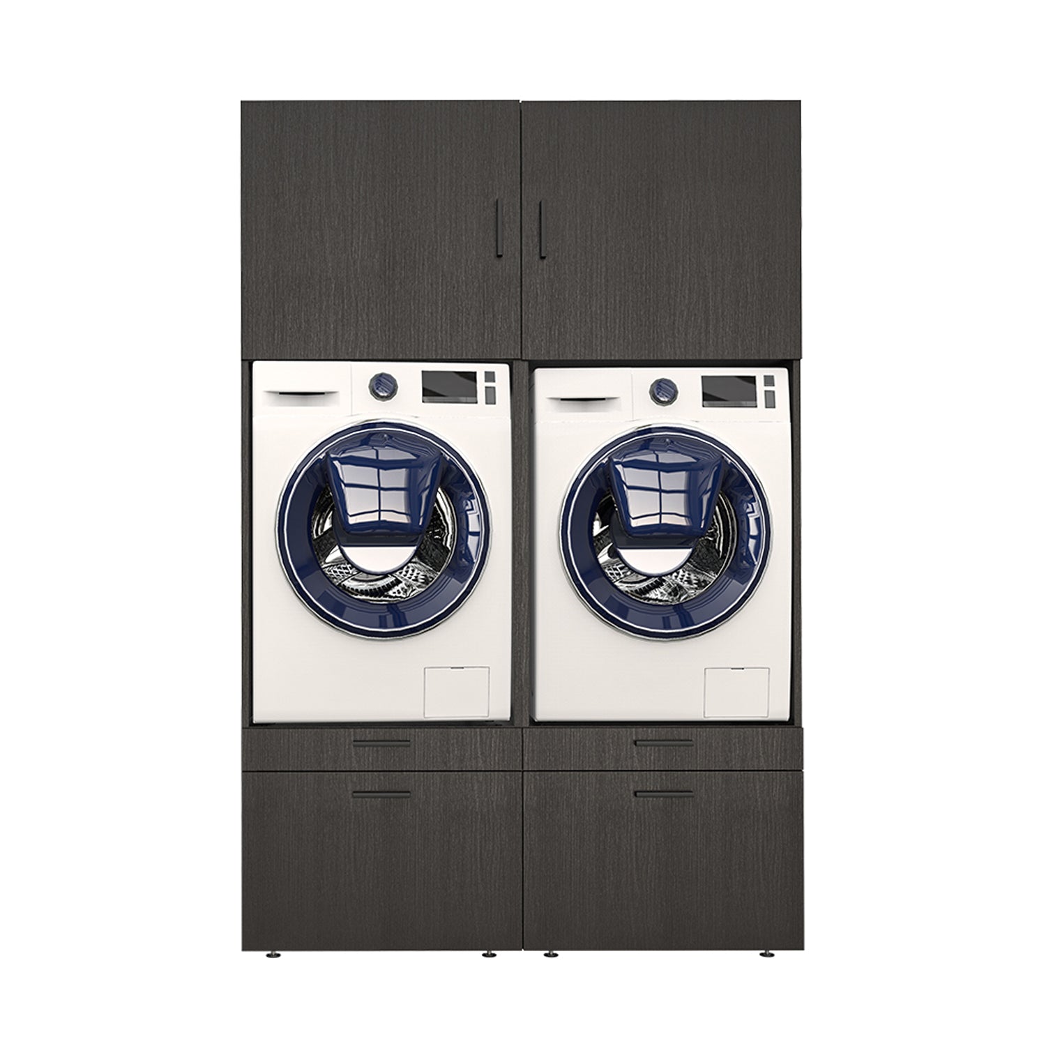 Eine platzsparende und praktische Kombination für Waschküchen mit 2 mal Waschmachinenüberschrank mit Schubladen und 2 Shrankaufsätze. Ausziehbrett für Waschkorb und Aufbewahrung für Wasch und Putzmittel unter dem Waschmaschine und es hat eine optimale Höhe, die Ihnen die Arbeit für Ihre Wäschen erheblich erleichtert.