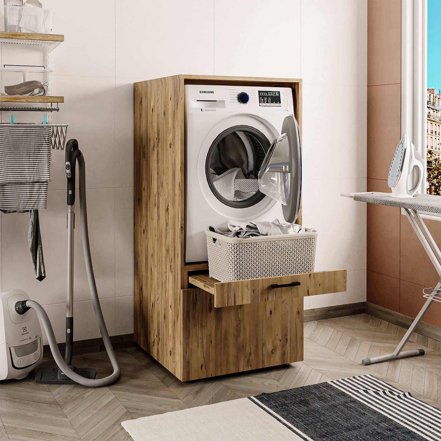 Roomart • Waschmachinenschrank für Hauswirtschaftsraum • HBT: 145x67x66,8 cm • Mit Schubladen und Ausziehbrett • Weiß • Schwarz eiche • Eiche
