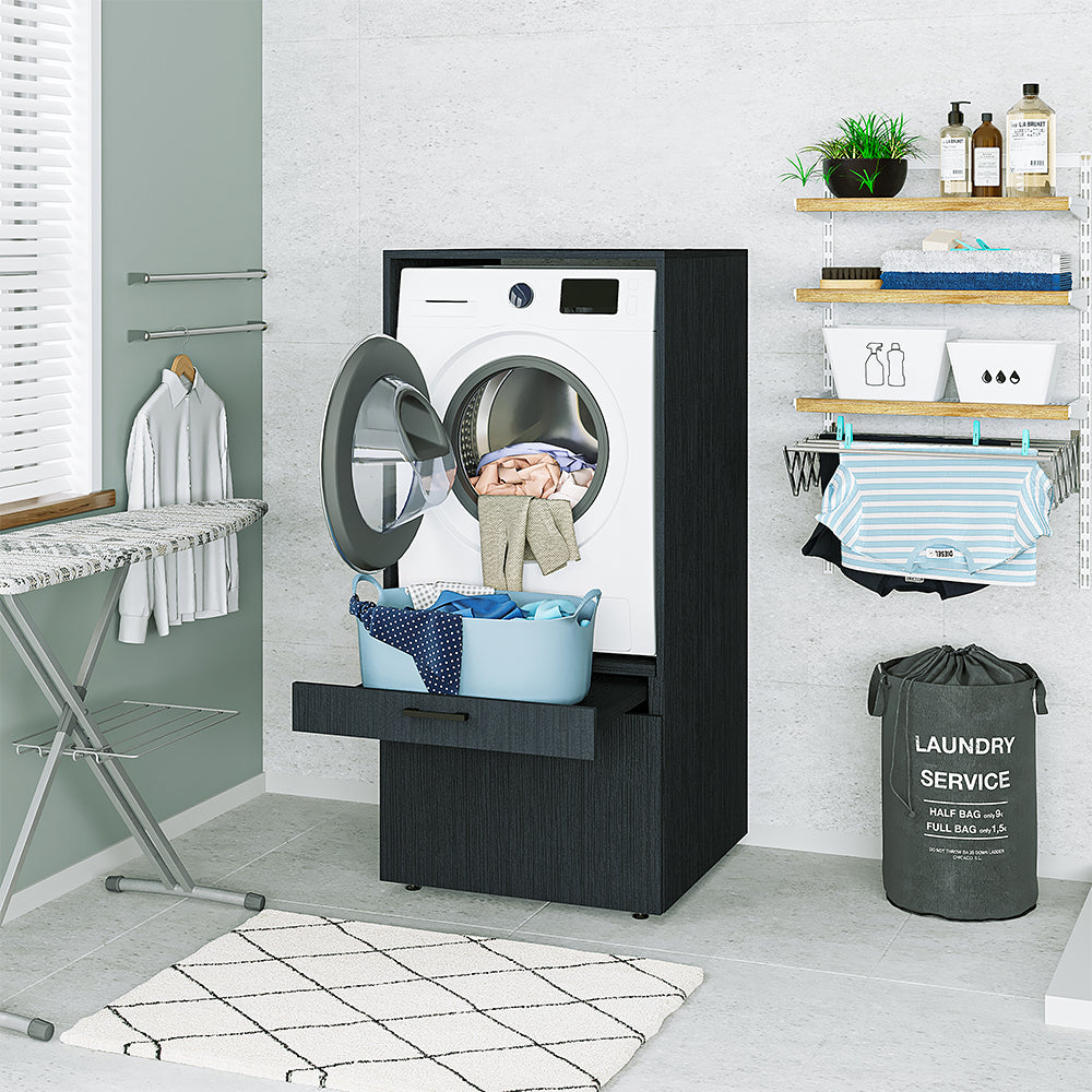 Roomart Waschmaschinenschrank für Hauswirtschaftsraum – SERIE 2 - Überbauschrank mit Schublade & Ausziehbrett, 145 × 67 × 66,8 cm – Weiß / Schwarz-Eiche / Eiche