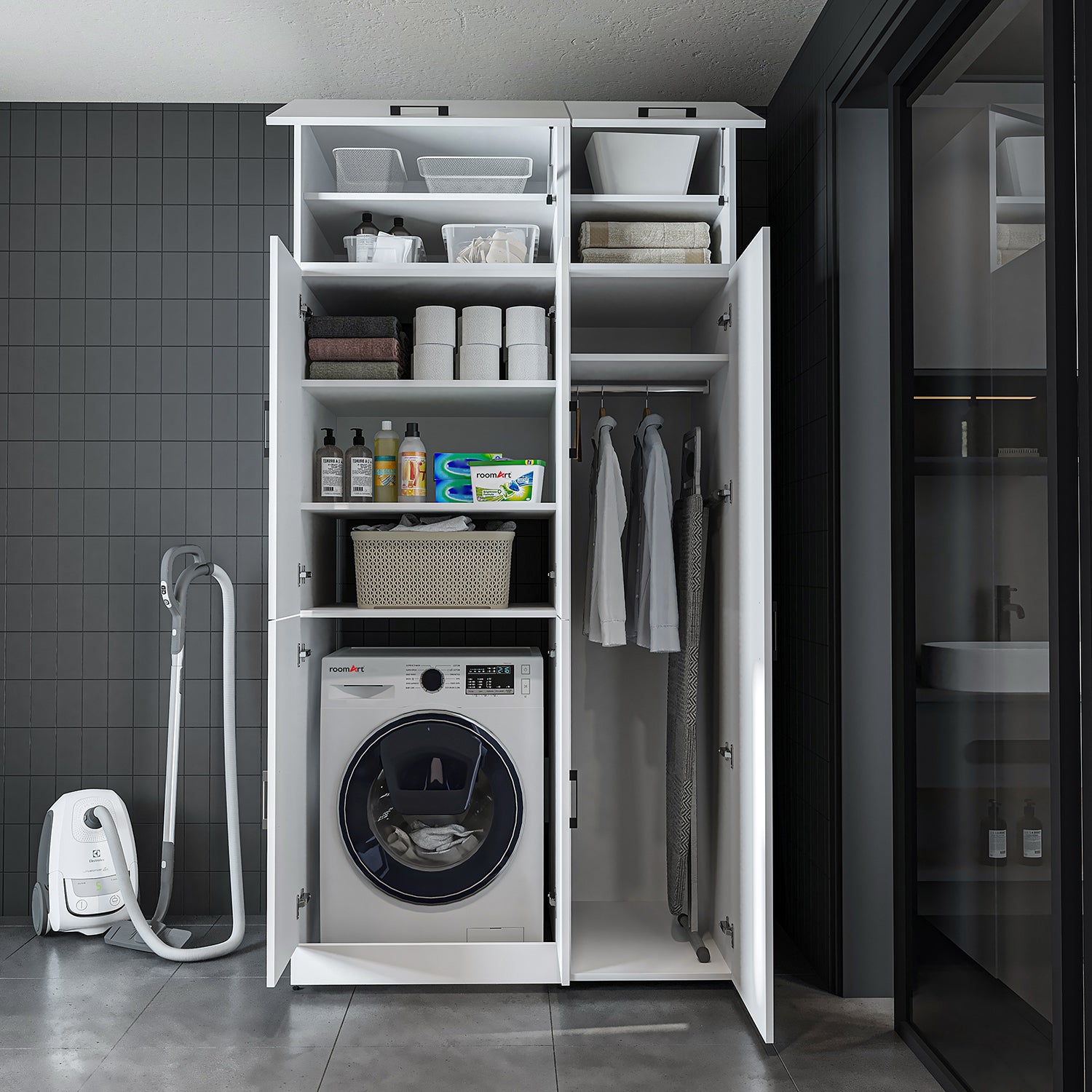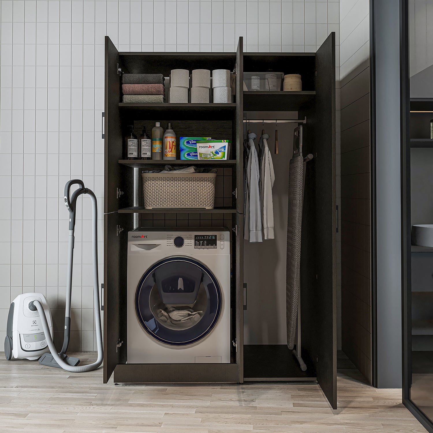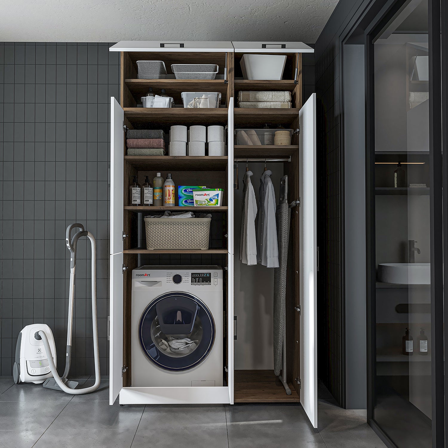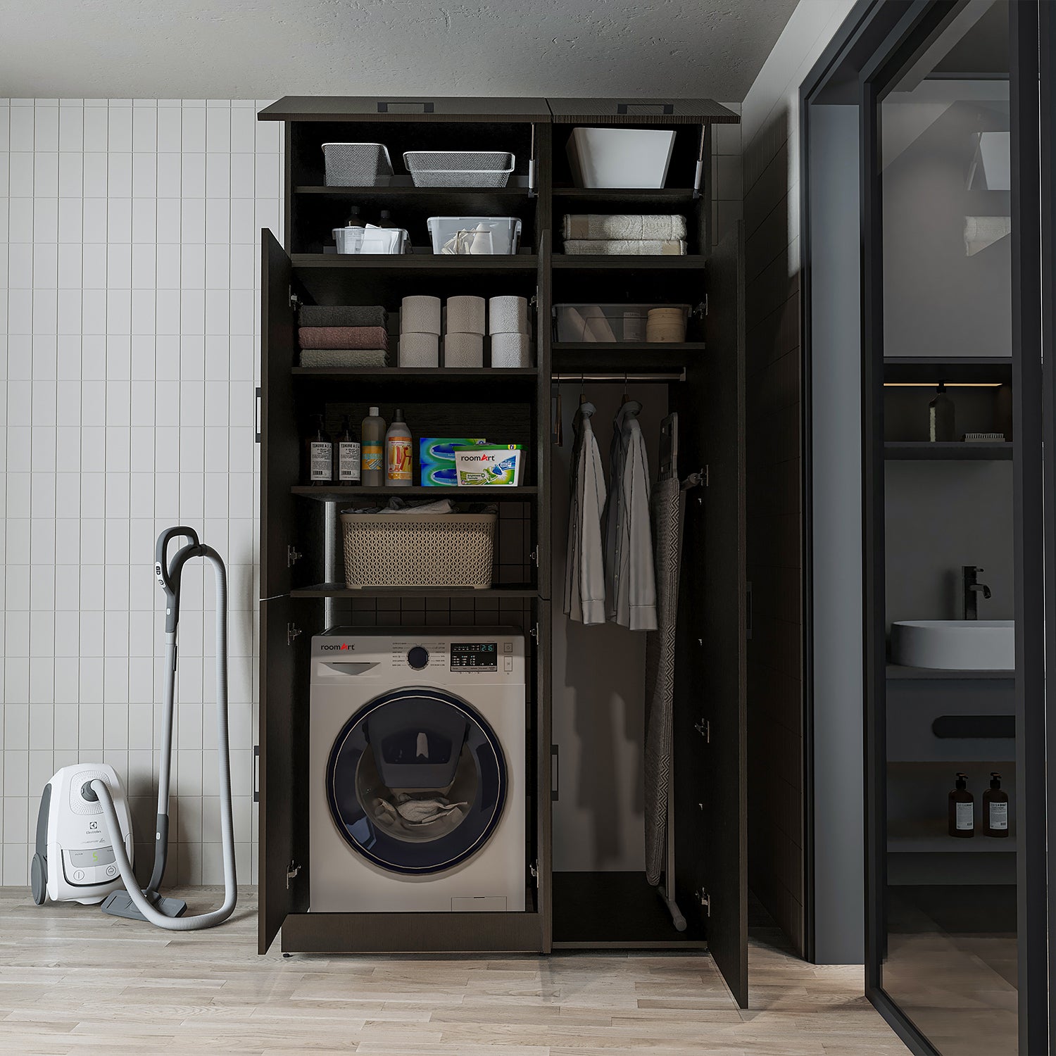 Roomart Waschmaschinenschrank „DORA 115 cm Breit“ für Waschmaschine & Trockner mit Regalböden, in 5 Farben • Weiß • Weiß Eiche • Anthrazit Eiche • Eiche • Schwarz Eiche