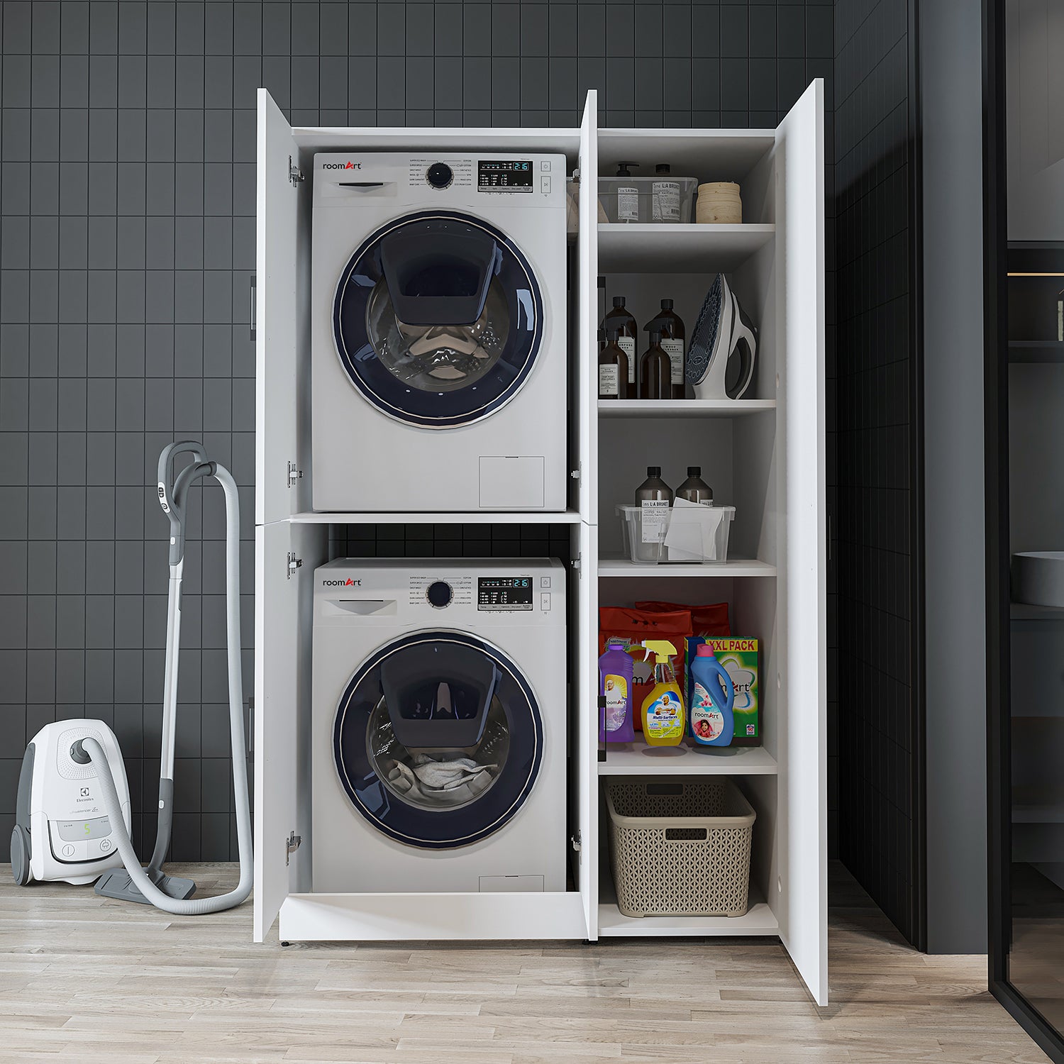 Eine platzsparende und praktische Kombination für einen Trockner auf der Waschmaschine oder mit Stauraum mit Türen. Die Regalböden können entweder als zusätzlicher Stauraum genutzt werden oder es kann ein Trockner darauf platziert werden. Die optimale Höhe erleichtert Ihnen die Arbeit mit Ihrer Wäsche erheblich.