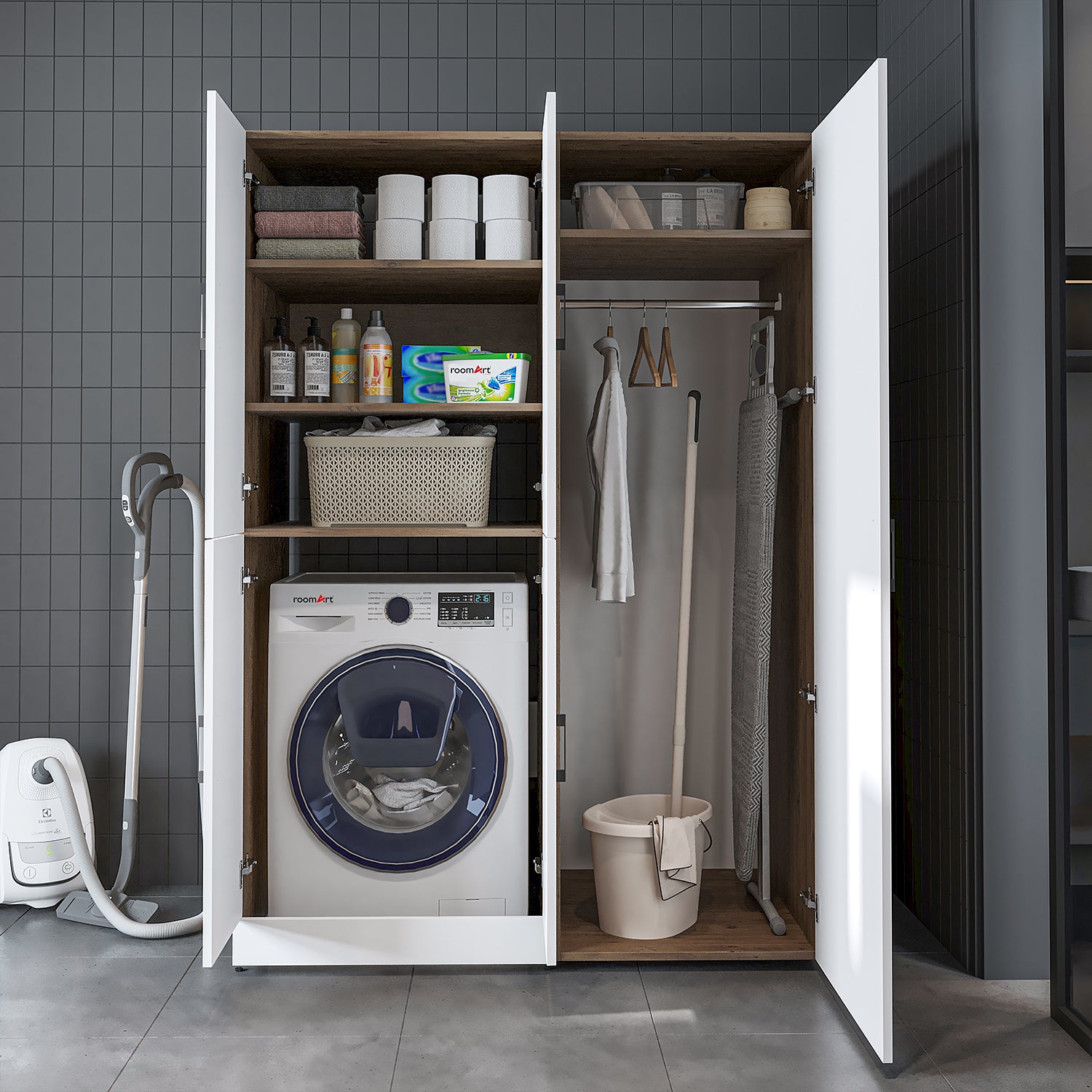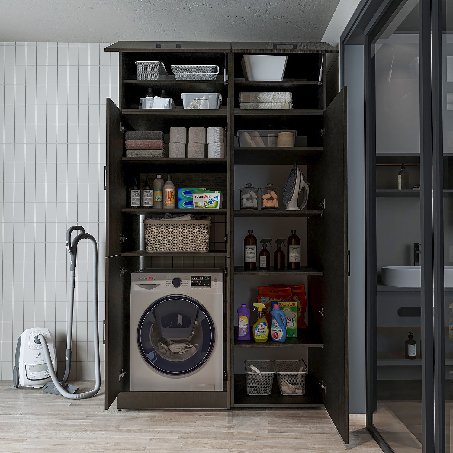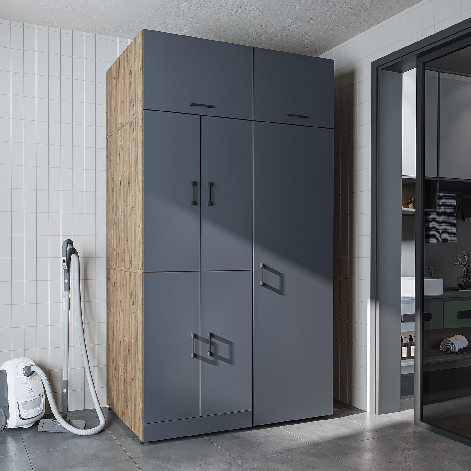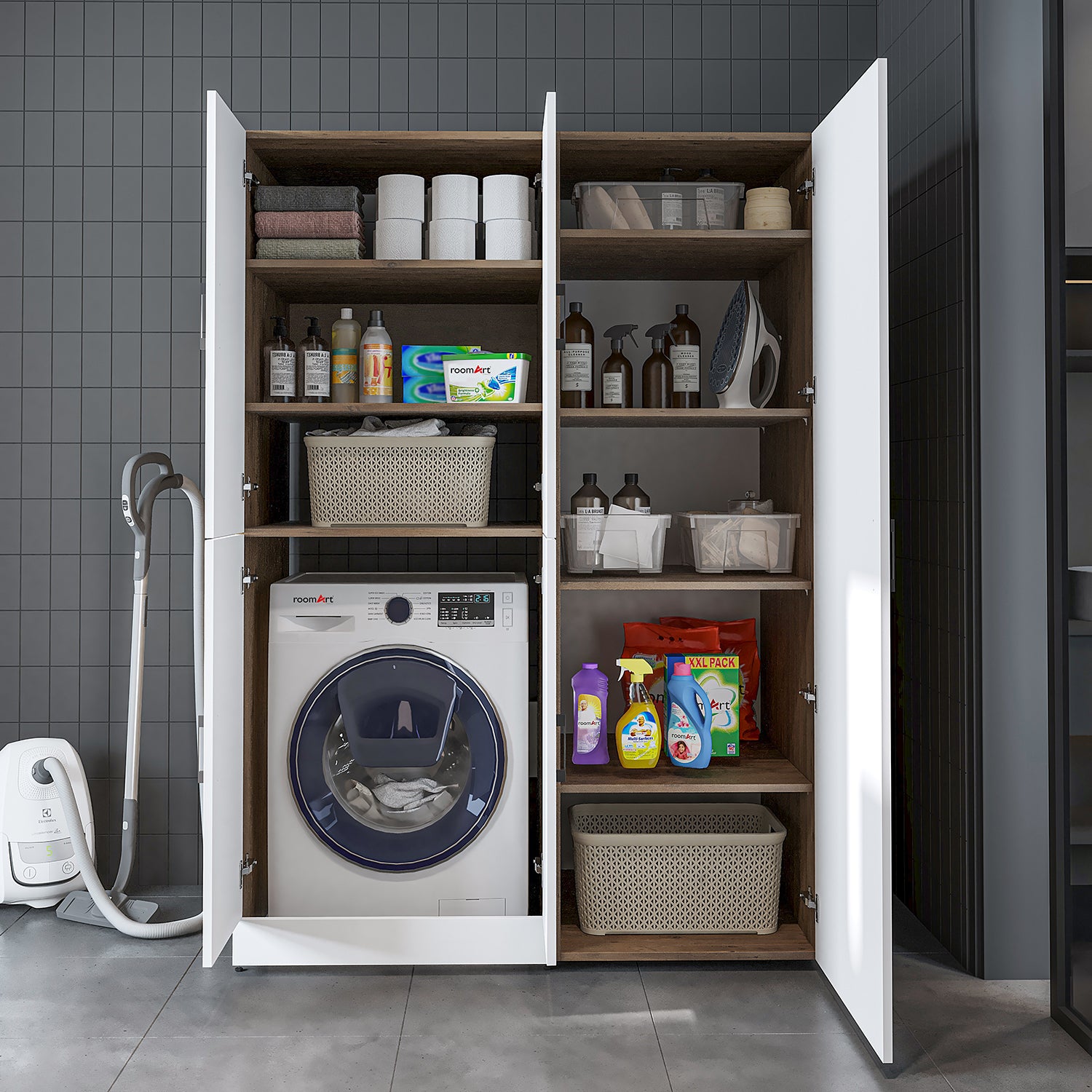 Roomart Waschmaschinenschrank „DORA 130 cm Breit“ für Waschmaschine & Trockner mit Regalböden, in 5 Farben • Weiß • Weiß Eiche • Anthrazit Eiche • Eiche • Schwarz Eiche (Kopie)