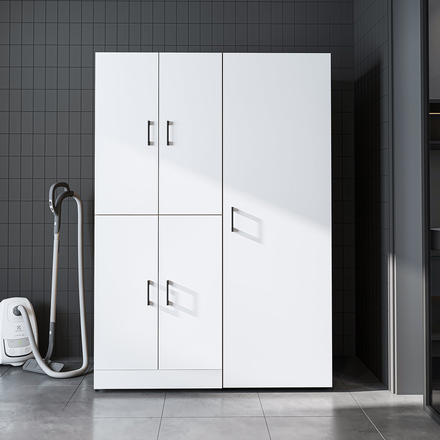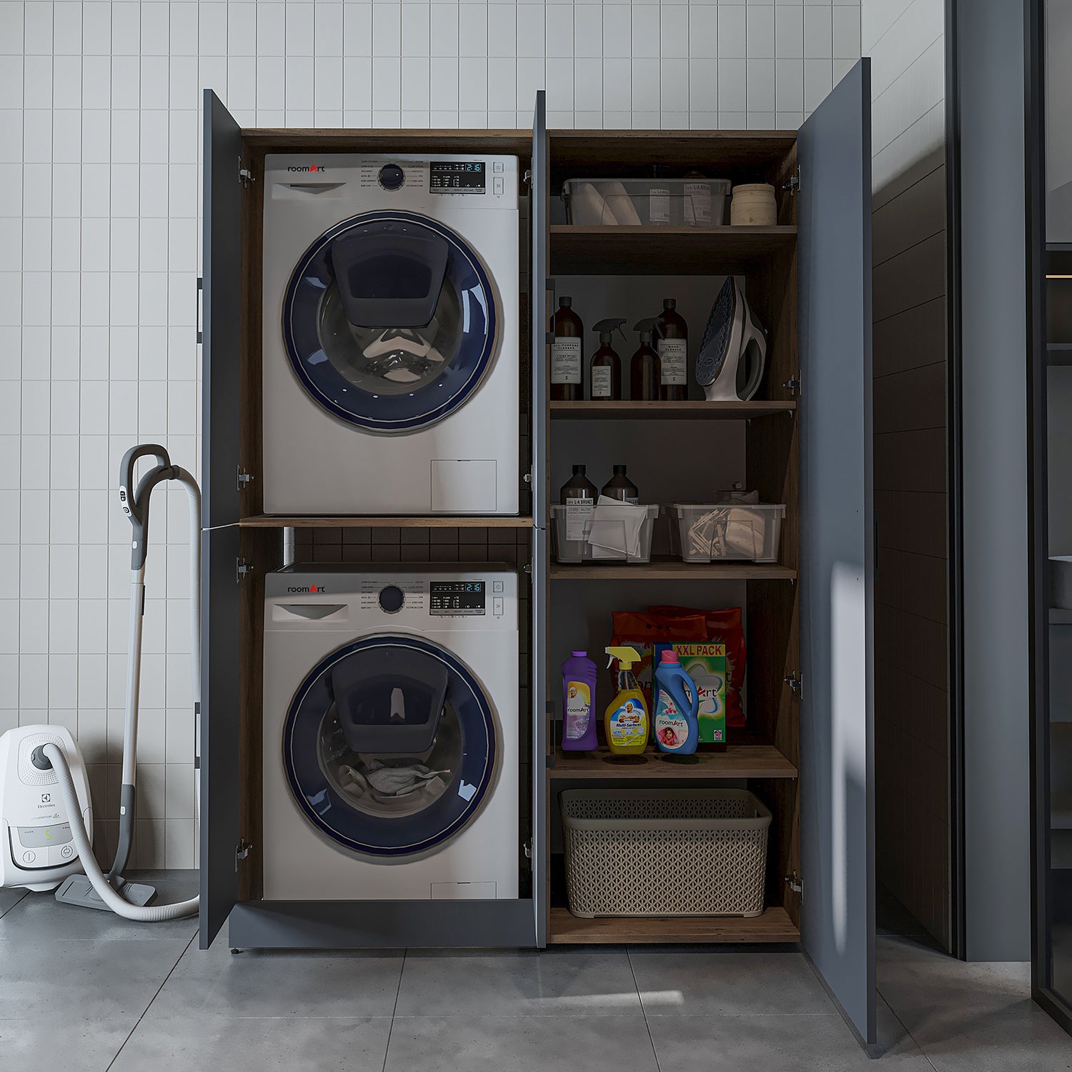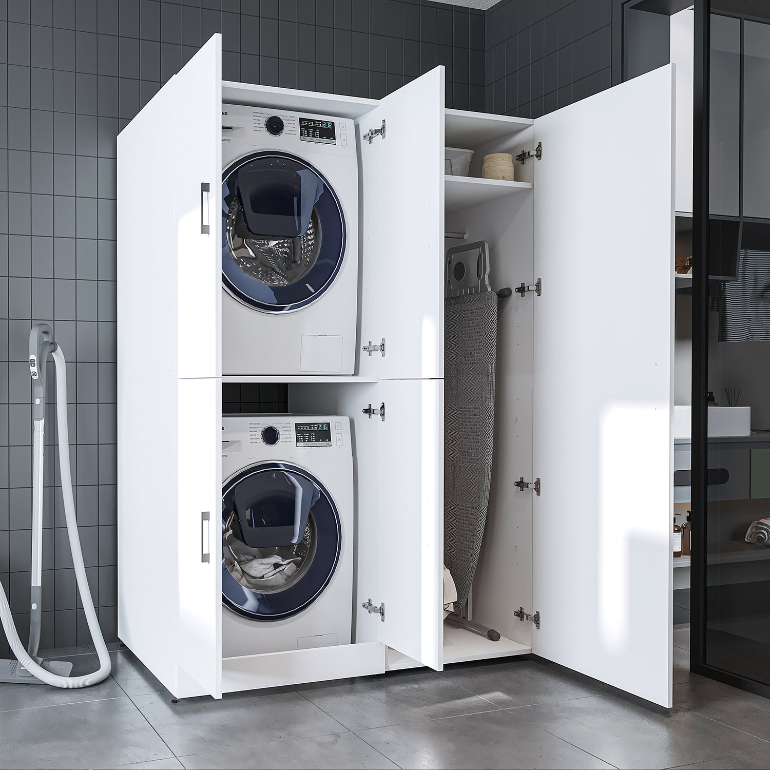 Eine platzsparende und praktische Kombination für einen Trockner auf der Waschmaschine oder mit Stauraum mit Türen. Die Regalböden können entweder als zusätzlicher Stauraum genutzt werden oder es kann ein Trockner darauf platziert werden. Die optimale Höhe erleichtert Ihnen die Arbeit mit Ihrer Wäsche erheblich.